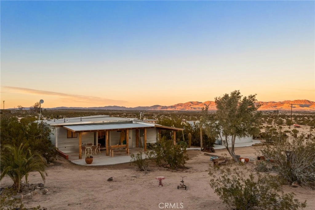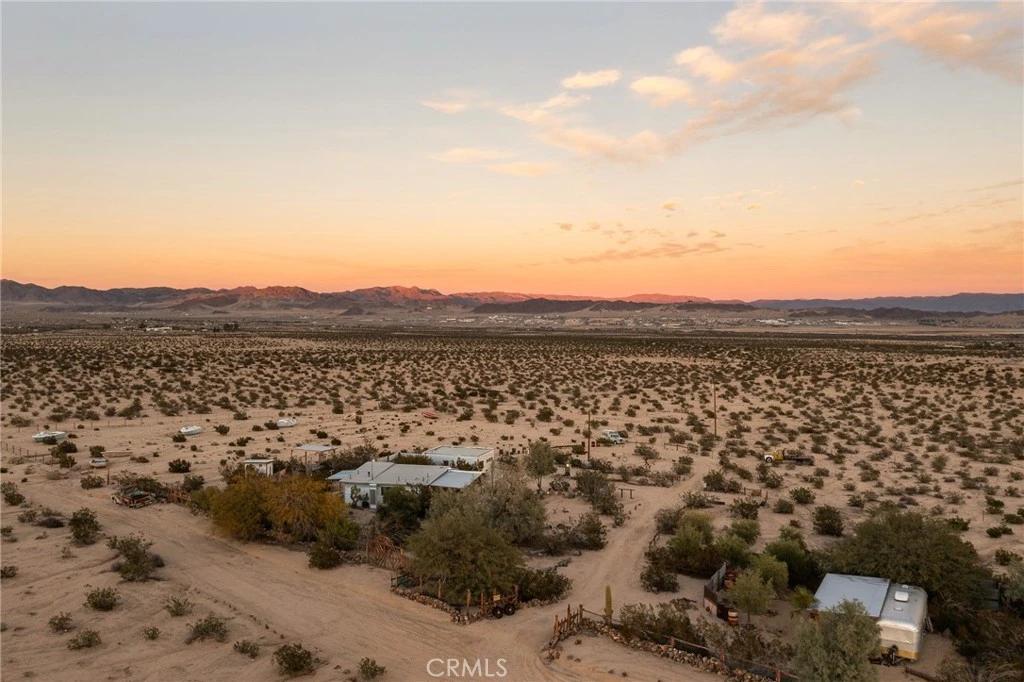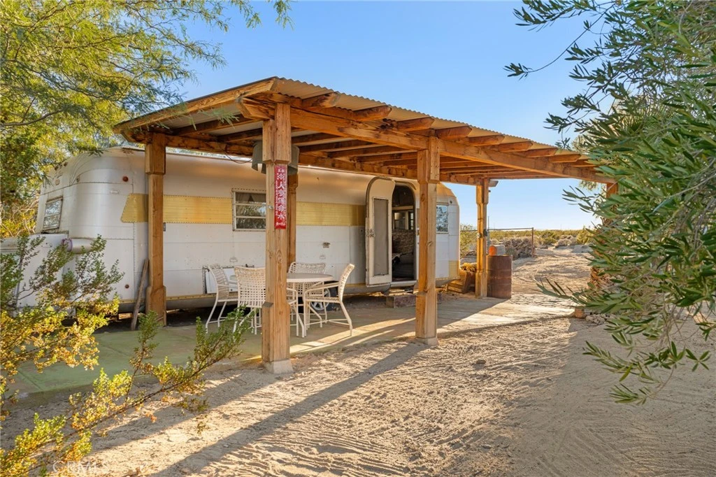 Discover your own private desert haven, where elegance and nature blend seamlessly on five enchanting acres. This remarkable compound invites you to experience a lifestyle of tranquil charm. At its heart lies a beautifully designed two-bedroom, two-bathroom main house, accompanied by a cozy studio casita complete with its own kitchenette and bath. Adding to the allure is a fully functional vintage Airstream station, thoughtfully connected to its own septic, water, and power, making it a perfect standalone retreat space. Every detail here is crafted for comfort and ease. With three newly updated septic systems and a modern electrical setup, you can enjoy peace of mind. There’s also an EV charger for added convenience. Step outside and find yourself surrounded by lush, mature olive trees and vibrant gardens, creating a green sanctuary that invites relaxation. Bordering open BLM land, you’ll enjoy breathtaking 360-degree mountain views and exceptionally dark skies perfect for stargazing. Just minutes from the western entrance of Joshua Tree National Park and the charm of downtown Joshua Tree and 29 Palms, this fully furnished short-term rental is a ready-made retreat. Whether you're looking for a perfect primary residence, a short-term rental opportunity, or a flexible mixed-use getaway, this property offers endless possibilities. (NOTE: Tax Records state 2-bedroom, 1-bathroom. Buyer is responsible to research to see if work was done with permits, and to confirm that this is a SFR and not a Rec Cabin zoning.)