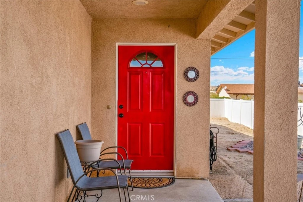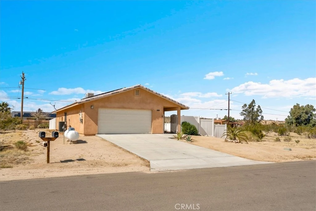 Welcome to this truly charming 3-bedroom, 2-bath home in 29 Palms, built in 2010 and located in the highly desirable Smoketree neighborhood. Offering 1,134 square feet of thoughtfully designed living space on a 9,143 square foot lot, this home blends comfort, character, and practicality. From the moment you arrive, you’re welcomed by a lovely outdoor sitting area at the entrance—perfect for enjoying your morning coffee or relaxing in the evening. The home features vaulted ceilings that create an open, airy feel, and a beautiful Spanish-style roof that adds timeless curb appeal and desert character. Inside, the spacious kitchen offers plenty of room to cook and gather, while the large living room with ceiling fans provides a comfortable space for entertaining or unwinding. All three bedrooms are generously sized, with the primary suite featuring its own attached bathroom for added privacy and convenience. The home is equipped with a brand new HVAC system, a brand new water heater, new refrigerator, and new dishwasher—making it truly move-in ready. The property runs on propane and includes leased solar at just $121.39 per month, helping keep energy costs manageable. Outside, a vinyl fence wraps the property for added privacy, and the two-car garage offers excellent storage and functionality. Located in one of the most sought-after neighborhoods in 29 Palms, this Smoketree gem is the perfect blend of charm, efficiency, and comfort. Home is a 5 minute walk to the dog park, playground and park.