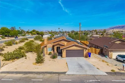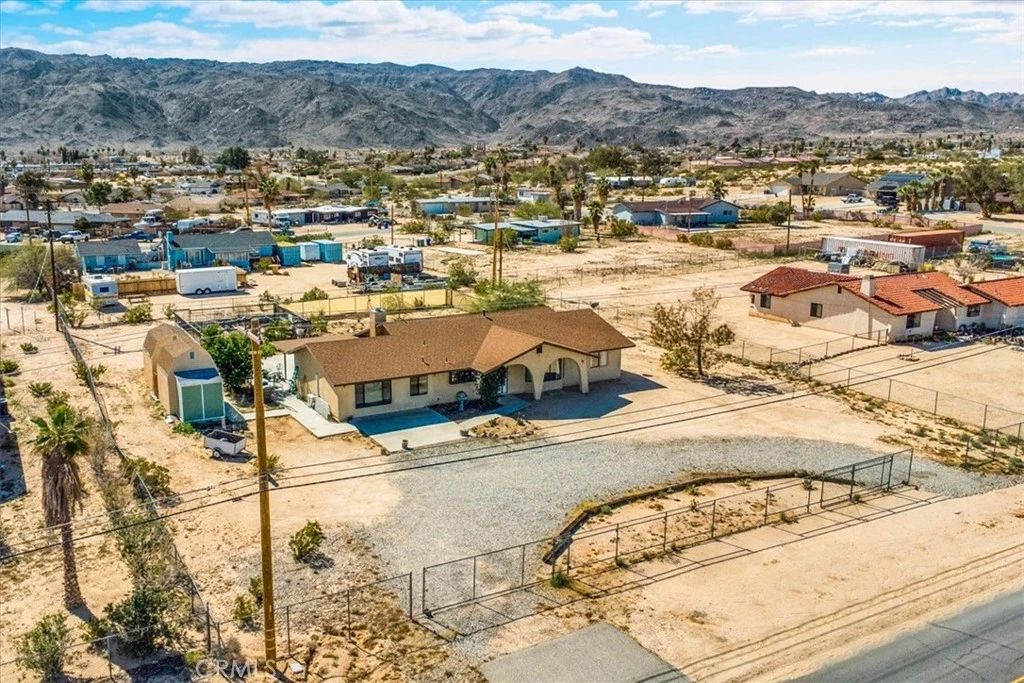 Looking for a spacious desert home or investment property with STUNNING mountain views?! Look no further! This centrally located home in the Chocolate Drop area of 29 Palms is nicely situated on .64 acres of land (FULLY FENCED) with a convenient semicircle driveway & beautiful mountain views to the North and South. Featuring 2,218 sqft of living space, this home offers a total of 4 bedrooms, 3 bathrooms, a family room AND a main living room with central heating & air throughout. The kitchen adorns warm wood cabinetry, matching white appliances, an oversized walk-in pantry and a large pop-out window above the kitchen sink to take in the beautiful desert views. Just off the kitchen is the light-filled living room which features a vaulted ceiling, a cozy wood-burning fireplace and charming built-in corner shelving. The 3 south-side bedrooms include newer ceiling fans and carpet flooring and the primary bedroom includes an ensuite bathroom with a single-sink vanity and shower/tub combo. This home also has a spacious laundry room just off the kitchen which leads to the 4th bedroom and 3rd bathroom (a previous garage conversion) complete with its own mini-split & walk-in closet making it a great guest room or second primary suite. Outside you'll be delighted to find a sizable covered patio, 3 SHEDS (2 of which are stucco'd and have 2 story storage rooms) and a fenced-in garden for those with green-thumbs. There are also Sun Run solar panels on the roof (currently not connected) that a buyer may either have removed or reconnected. With plenty of space to entertain or relax around a firepit on a starry desert night, this property has A LOT to offer! Schedule your showing today!