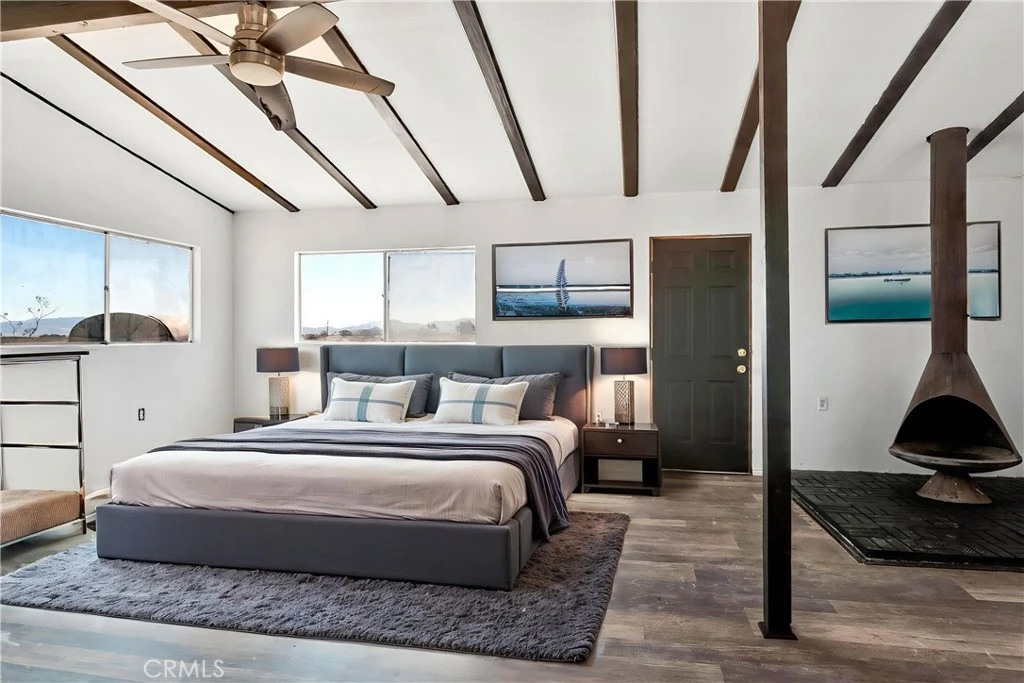 Joshua Tree back entrance location - Ultimate Wonder Valley private Rec Cabin with simple luxury in the High Desert on five expansive acres. Professionally renovated - this spectacular tiny home features an airy living and dining space with beamed ceiling with custom framed doors and windows, Morso WB fireplace and a generous living area. Brand new double lined stucco on the outside and fully insulated detailed craftsman finished work on the inside. NEW ROOF just installed and 20 foot beamed ceiling at the peak. Upgraded Electric Panel. The Power is on to this house and previously had hauled water. Bathroom and Kitchen framed will need to be finalized. Area is booming with Artists, New Restaurants, and Hip People of all ages. Wonder Valley is less than 15 minutes from the entrance to Joshua Tree National Park! As you approach the property, 360 degree panoramic views surround you, stretching from JTNP to the south to Mojave Trails National Monument to the North. The charming facade with its stonework accents welcomes you to explore further w- 5 private acres, you have plenty of room to expand your dreams. There are fewer and fewer of these unique Rec Cabins that haven’t be bought up by big land companies - don't miss out on your chance to own your personalized hi-desert hideaway. Move in ready. Pictures say it all. Offered $79,900 Firm CASH. (Property is virtually staged)