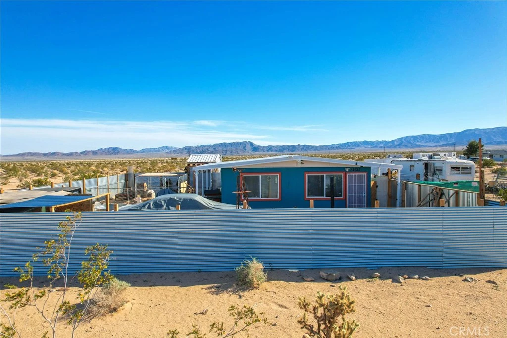 Welcome to a Hi-Desert oasis nestled in breathtaking Wonder Valley! This off-grid retreat sits on an expansive 5-acre lot, surrounded by sweeping desert views and majestic mountains stretching as far as the eye can see. With a prime location just off a paved road, this cabin offers the perfect blend of accessibility and seclusion, making it an ideal spot for those seeking peace and solitude. As you arrive, you'll be struck by the stylish corrugated steel fencing in the front, paired with perimeter fencing around the cabin for added privacy and security. Inside, large windows flood the space with natural light, creating an open and airy ambiance throughout the home. The cabin’s character shines through with features like wood laminate flooring, exposed wood beams, modern lighting, and trendy wood paneling. Every inch of the cabin’s square footage is thoughtfully utilized. The kitchen is efficiently laid out with minimalist shelving, white cabinetry, and a refrigerator, offering everything you need in a compact yet functional space. The Murphy bed is a clever addition, allowing you to easily transform the living area into a cozy sleeping space perfect for a restful night's sleep in the tranquil desert environment. Step out onto the back patio, an ideal setting for BBQs or evening dining under the starlit sky. There’s even an outdoor steel tub for a unique, rustic soak in nature. The recently remodeled bathroom features a full tub, shower, vanity, wood laminate floors, and stylish wood paneling, bringing a touch of luxury to this desert hideaway. Living off-grid is made simple with the 110V solar power system, allowing you to embrace sustainable living without sacrificing modern comforts. And when you’re in the mood for a night out, The Palms Restaurant is just a short trip away, offering great food close to home. Joshua Tree National Park is also nearby, and you’re just a quick drive from the iconic Roy’s in Amboy. This charming Wonder Valley cabin is truly one-of-a-kind. With negotiable furniture options, it’s turn-key ready—don’t miss your chance to own this desert gem!