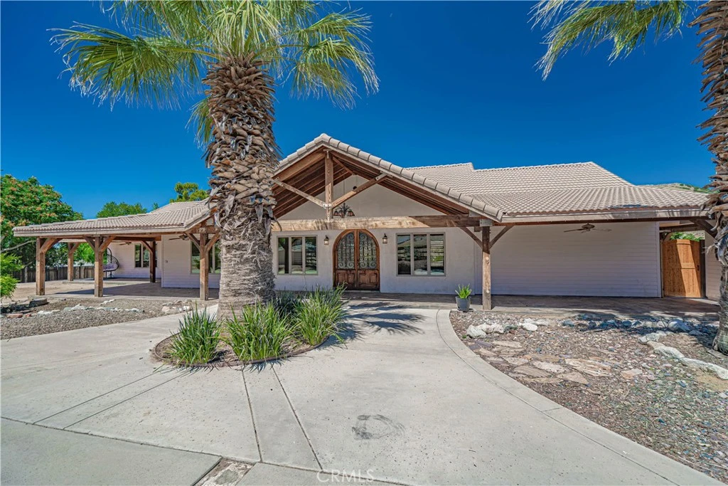 Sprawling Single-Story Equestrian Estate on 5 Usable Acres. Welcome to your dream home! This expansive single-story property sits on 5 fully usable acres and boasts an open floor plan featuring 5 bedrooms, including a large room with a private bathroom and entry—ideal for next-gen living or guest quarters. The main living area impresses with high vaulted ceilings and an inviting great room with a wood-burning fireplace. The chef’s kitchen is a culinary delight, equipped with skylights, a large bar-top island, stainless Sub-Zero refrigerator, Viking cooktop & double oven, Brazilian granite counters, and a spacious walk-in butler's pantry with a sink and dishwasher. Entertain in style in the formal dining room, or enjoy casual meals in the breakfast nook. The primary suite is a luxurious retreat with a stone fireplace, a large walk-in closet, and an en suite bathroom featuring wood wainscoting, dual vanities, a large jetted tub, and a dual-head walk-in shower. This high-quality custom home boasts exceptional craftsmanship with 2x6 exterior construction, TechShield radiant barrier in the roof, Eagle roof materials, and radiant heat hardwood floors throughout. The elegance continues with hand-scraped white oak double arched doors, Bruce hardwood maple cherry wide plank flooring, solid core teak interior doors, and window shutters throughout. Equestrian enthusiasts will appreciate the 2,400 sq. ft. brick-lined custom 10-stall breezeway barn, six different fenced pastures, a legal-size dressage arena with lights, and large shaded shelters in all pastures. These facilities are conveniently located on a lower level, easily viewed from the home. Enjoy breathtaking views from both the full-length front covered patio and the rear patio overlooking the equestrian facilities. Additional features include a detached insulated 3-car garage with Anderson windows and Wayne Dalton foam-insulated garage doors. This rare, paved-road equestrian property also offers a 10kW solar power system and natural gas service, ensuring maximum utility savings. Don’t miss the opportunity to own this exceptional property combining luxury living with top-notch equestrian facilities!