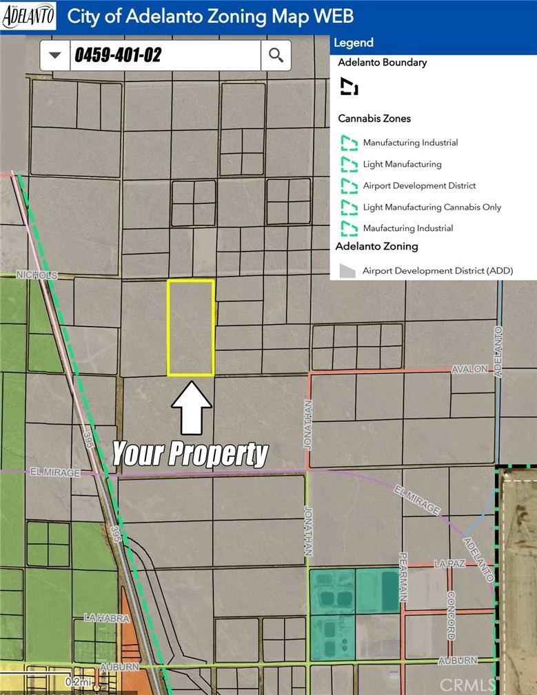 18.51 ac of ADD (Airport Development District) land in Adelanto, providing a wide range of Industrial and Cannabis use. Located just north of El Mirage Rd and about 2,000 ft East of Hwy 395 on Nichols Rd. Significant Industrial Development in the area including the new Amazon Distribution Center and SCLA developments.