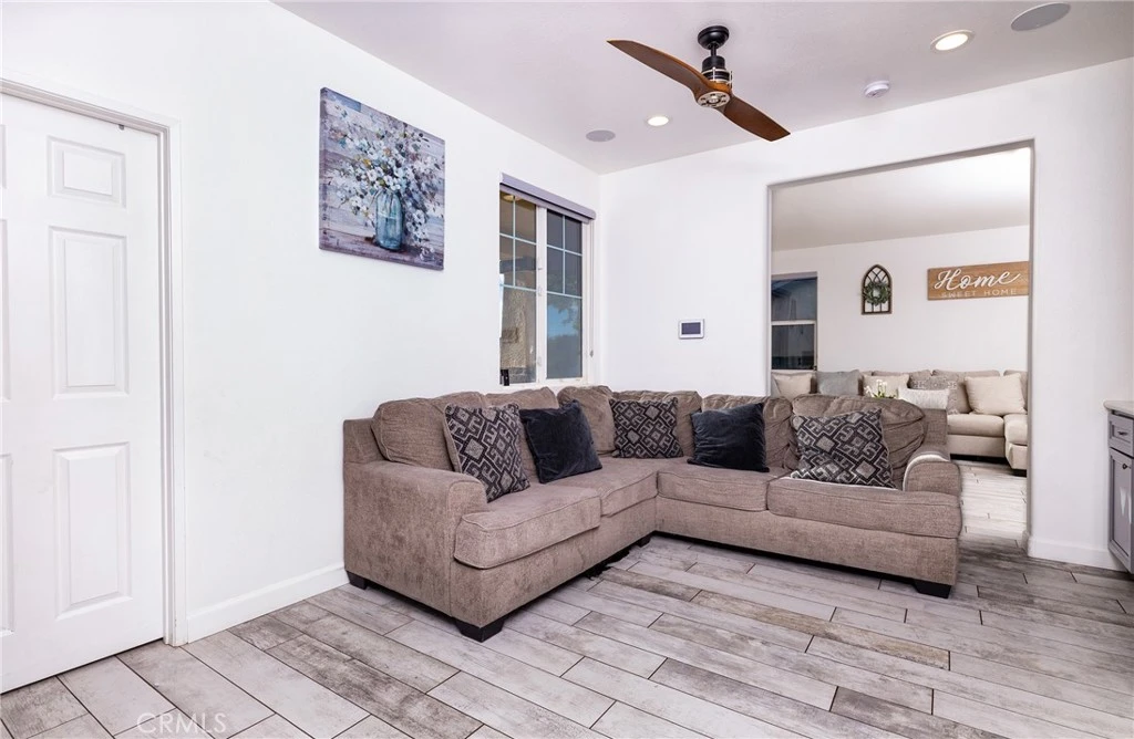 5 bedrooms, 2 bathrooms, plus a spacious office/den with a built-in desk, with 2,183 Square feet. This home has it all, including modern updated finishes, modern white-washed tile flooring throughout, cozy fireplace in family/dining room off of kitchen, ceiling fans in all bedrooms, wood wall accents, amazing large updated kitchen with lots of storage with on-trend grey cabinetry, quartz counters, glass tile backsplash, stainless steel appliances, farm sink & range hood, pendant lighting. Guest bathroom with double modern, bowl sinks & faucets, grey cabinets, master suite with view of the incredible back yard and pool, updated modern main bathroom with soaking tub, wow! The shower has blue glass tile accents, a front shower head, and another square above it. Double bowl sinks and modern faucets. And did I mention the backyard? It's amazing: artificial turf, the sparkling Pool & Spa with a water slide and waterfall, a cozy fire pit, a covered pergola wired for outdoor television & twinkle lights, and plenty of room to practice on your personal putting green. Paid for solar.