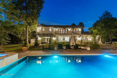 Welcome to a one-of-a-kind modern farmhouse estate located on the border of Calabasas and Agoura Hills, in a private gated community of just seven luxury homes. Offering nearly 2.5 acres of serene, resort-like grounds, this exceptional property combines total privacy and natural beauty with unmatched convenience just two minutes from the 101 and walking distance to Erewhon, Starbucks, and more. Finished in 2024, the estate backs directly onto the Santa Monica Mountains Nature Reserve, with private access to hiking and biking trails, ensuring that no future development will ever disrupt your peace. The main residence, guest house with its own address, pool house, and writer's cottage are all thoughtfully arranged across the property, providing an ideal setting for multigenerational living, creative work, and luxurious entertaining. Inside the main home, you'll find four spacious ensuite bedrooms and two additional half baths. The primary suite is a true retreat, complete with a fireplace, custom walk-in closet with in-house dry-cleaning, and a private spa-style patio featuring a cold plunge, hot tub, infrared sauna, and massage table. At the heart of the home is an expansive great room that opens seamlessly to the backyard, centered around a stunning 18-foot linear fireplace. The chef's kitchen is outfitted with top-of-the-line Thermador and Gaggenau appliances, a grand center island, floor-to-ceiling windows, and cozy gathering spaces including a fireplace, coffee bar, and smoothie bar. A separate bonus area and a second-story, soundproof home theater and music studio round out the interior spaces. The four-car garage includes a full gym and professional-grade golf simulator. Step outside to discover a saline pool with hot tub and waterfall, a peaceful creek with a stone bridge and shaded sitting area, and a fire pit with built-in seating for fifteen. The grounds also include a putting green with four tee boxes and a bunker, an in-ground trampoline, meditation fountain, swings throughout the property, bocce ball court, ping pong deck, outdoor kitchen with Firemagic BBQ and Italian Alfa pizza oven, herb gardens, hillside orchard, and a dog grooming station. The guest house features two separate living quarters, one ADA-compliant each with private patios, full kitchens or kitchenettes, custom bathrooms, and panoramic views of the pool and orchard. A covered outdoor lounge area includes dual TVs, ceiling heaters and fans, and a fireplace, creating the ultimate entertaining space. The writer's cottage offers a loft, air conditioning, and ample storage, ideal as a studio or private office. This home is more than a residence it's a retreat, an entertainer's dream, and a sanctuary all in one. With direct access to nature, modern elegance at every turn, and easy proximity to Calabasas, Malibu, and top-tier schools and amenities, this rare estate embodies California luxury living at its finest. Furnishings available. Shown by appointment only.
