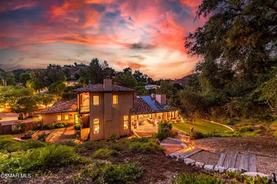 Nestled behind the private gates of Agoura Hills' prestigious Medea Valley Estates, this magnificent residence is a rare offering of space, elegance, and serenity. Live the single-story lifestyle with a main-level primary suite that rivals any luxury hotel. Situated on a flat, beautifully landscaped 1.08-acre lot, this one-of-a-kind estate is privately gated within the gated community -- offering an unmatched level of privacy and peace. From the moment you arrive at the circular motor court, you'll sense the extraordinary quality and attention to detail that define this home. At approximately 7,134 square feet, the home offers a seamless blend of grand scale and intimate comfort, providing both dramatic entertaining spaces and warm, inviting areas for everyday living. Step through the double doors into a dramatic foyer, where a sweeping staircase sets the tone for the timeless elegance found throughout. The formal living room is a showstopper with its vaulted ceilings, fireplace, wet bar with sink and two wine refrigerators, and an expansive wall of windows that frame the tranquil outdoor vistas and views of the pool and waterfall. Whether you're hosting holidays or an intimate dinner, the formal dining room impresses with a coffered ceiling with windows that look out to the pool. The heart of the home is the remodeled gourmet kitchen, thoughtfully appointed with custom cabinetry, Viking appliances, six-burner range with griddle and double oven, apron farmhouse sink, and a massive center island ideal for both prep and gathering. A walk-in butler's pantry doubles as a prep kitchen, and the nearby climate-controlled wine closet is a connoisseur's dream. There is bar seating and an adjacent breakfast and dining area. This great room floorplan includes the adjacent family room with fireplace, high ceilings and views of the pool and lush backyard invites you to unwind in comfort. Need to work from home? The executive office features rich wood details, fireplace, and a stately coffered ceiling -- no artificial backgrounds needed as this office is the perfect backdrop for your most important video calls.The main level primary suite features its own rotunda sitting area, fireplace, and French doors leading to the yard, it's a true retreat. The spa-like primary bath boasts dual sinks, a soaking tub, walk-in shower, and a massive walk-in closet with custom built-ins. An additional guest suite on the first floor offers privacy for visitors or multigenerational living with large closet and access to the yard. Upstairs, you'll find three generously sized en-suite bedrooms, each with remodeled bathrooms and spacious closets, as well as charming study and reading nook areas, perfect for homework or quiet time. The second floor also offers a 6th room perfect for a home gym with sauna. Step outside to your own personal resort. The Pebble Tec pool and spa are accented by a dramatic waterfall water feature, while the outdoor kitchen offers a built-in BBQ, extra-long porcelain slab counter, bar seating, two burners, sink, and refrigerator -- ideal for unforgettable alfresco evenings. The fully covered and open-air patios provide multiple spots for lounging and dining, while the firepit and bocce ball court add fun and relaxation. The lush lawn, an amazing variety of fruit trees (see feature sheet for the full list), and expansive landscaping frame the outdoor spaces beautifully. Best of all, the community backs to Paramount Ranch trails, giving you direct access to miles of natural beauty -- hike, bike, or horseback ride right from your backyard.Additional highlights include five fireplaces throughout the home, wood flooring throughout, large laundry room with sink and storage, three zone newer HVAC units, newer water heater, whole-house Generac generator for uninterrupted power runs on the attached natural gas line and newer, large 400 AMP electrical panel and top rated Conejo Valley School District. Just 13 miles to Malibu!