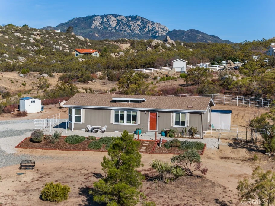 Such a beautiful Lake Riverside Estates newer (2018) home on a gorgeous parcel, ready for horses!! This clean home is well maintained, installed on a permanent foundation and offers 2.68 acres of lovely usable land with a great private well (no water bill and the well pump was just replaced in March 2024). Enjoy fabulous long mountain views of the Palomar Mountain range and westward clear sky sunsets from this beautiful location. The home is in great condition with an open floor plan, lots of great light coming through, and spacious primary bedroom (located on opposite side of the home from the other 2 bedrooms and full bath). Refrigerator, washer and dryer included. There is a wonderful custom built rear covered patio deck with enclosed/fenced yard area, trees and sheds. This property is horse ready with spacious corral fencing already in place with walk in cover/shelters, a Tuff Shed tack room and covered feed area. Lots of room for a round pen or further improvements (workshop/garage) and direct trail access from the property. Miles of riding throughout the community or the adjacent National Forest and BLM trails. There is a 50-amp RV hookup with parking and additional storage sheds. The Lake Riverside Estates community is a historic Equestrian and Aviation community offering a community arena, round pen, and trails, a 3600ft private lighted airstrip, sports courts, fishing lake (catch and release), picnic areas and so much more. There is a Cal Fire station located within the community. The roads are HOA maintained, the skies are blue and the shopping nearby in Temecula. Must see to take it all in. Great pricing to enter the community.