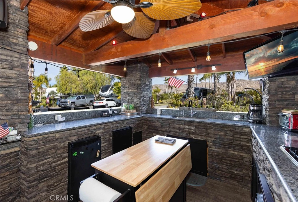 Here it is, the one you have been waiting for... Such a Cute place with a Fabulous View of the Water, Golf Course, Mountains and Sunsets. Front Private Entrance has a 4 hole putting green with a Waterfall Pond and Hollywood Hedges that are perfect addition to the Belly up Bar Entertainment Island overlooking the Kitchen with Granite Counters, reverse osmosis drinking water, Fridge & Freezer, Hot water heater, Stove & Oven and 65 in TV on Fireplace Table and dark cabinets. The access to the fully screened Tile Roof Buildout & Gutters with extended Allumawood cover and has 3 Screen slider entrance Open Beam Ceilings, Stacked Stone walls and Pillars with a Dining area with step up Family room with 65 in TV and Gorgeous Wood looking Tile throughout. Outside has Old World Stone Blocks, Stained Concrete Pad with Gate to the Grassy Knoll and large common area space on the west side of property with dog fence that surrounds the property. Included in Rancho California RV Resort is a 14 hole Executive Golf Course that is unlimited play, 5 Pools and Jacuzzi areas, Tennis Courts, Pickle Ball Courts, Laundry Rooms, Dog Park, Horse Shoe Lawn, Club House, Hiking Trails, and Restaurant all inside Gated Community that is Guarded 24/7. You can live here or rent your space. Peace and quiet serenity all just 25 minutes from Temecula Wine Country. No age restrictions. Financing Available... Come on over and check this hidden gem of a place out...