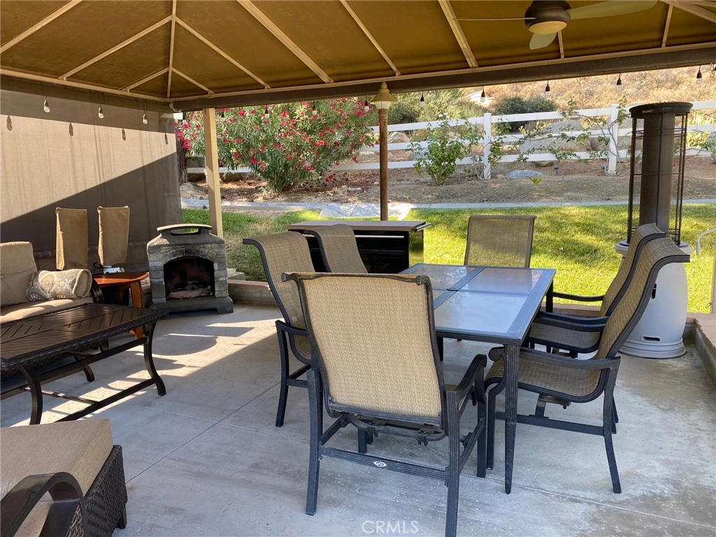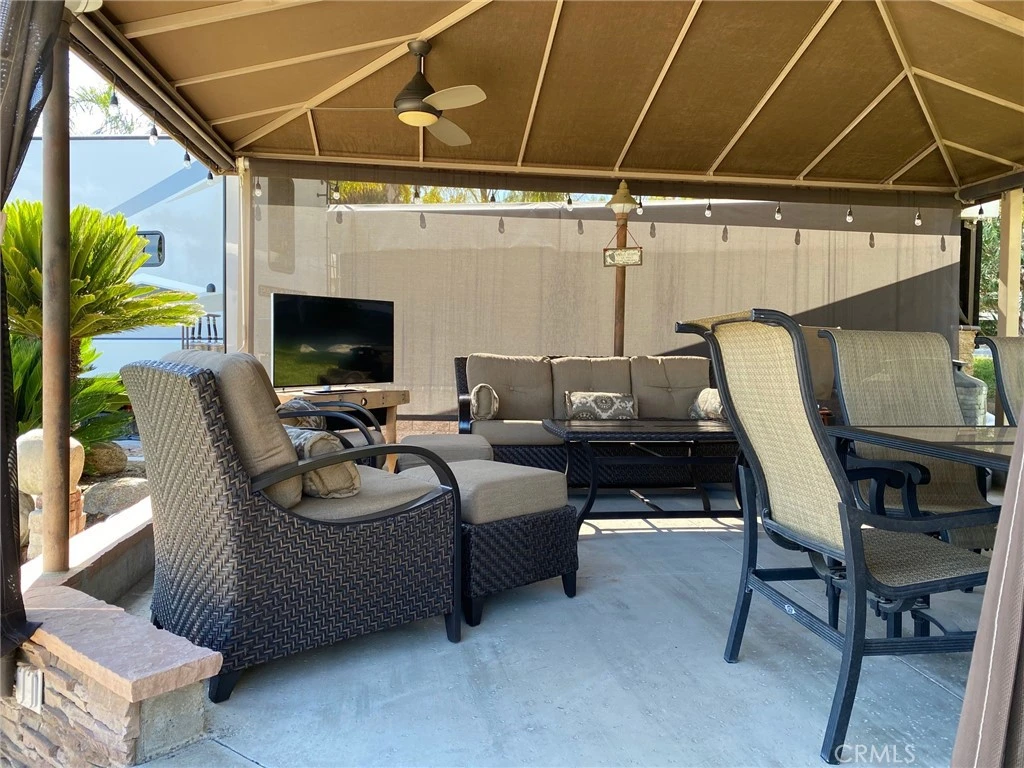 This uniquely designed property has a large expanded patio that backs up to the hill side.There will never be anything built behind you. The restrooms with showers is across the street and up a couple sites. A perfect amenity if you do any entertaining. Lush landscape surrounds the entire property. Including a palm garden at the very front of the site with a built in cabinet that can house the charger for your golf cart. Pull your cart next to the garden curb to keep it out of the entry way and have easy access to the charger. Heading to the back and four steps up is a the great room nestled under a canvas canopy. Sun shades can be raised or lowered to control temperature, and create privacy. Ceiling fans with lights make evenings outdoors a delight. This spacious area is currently furnished with quality furniture including a large dining set. All this high end furniture is included in the purchase Back down the stairs behind your RV is the well designed kitchen/laundry area. Here you will find a built in BBQ, side burner, under counter fridge, storage, sink and front loading washer and dryer. Counter space is a cooks dream with plenty of room for folding the laundry. There are additional ceiling fans with light in the kitchen area as well. PRICE REDUCED $115K GOLF CART INCLUDED Seller will consider financing.