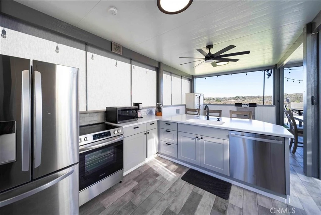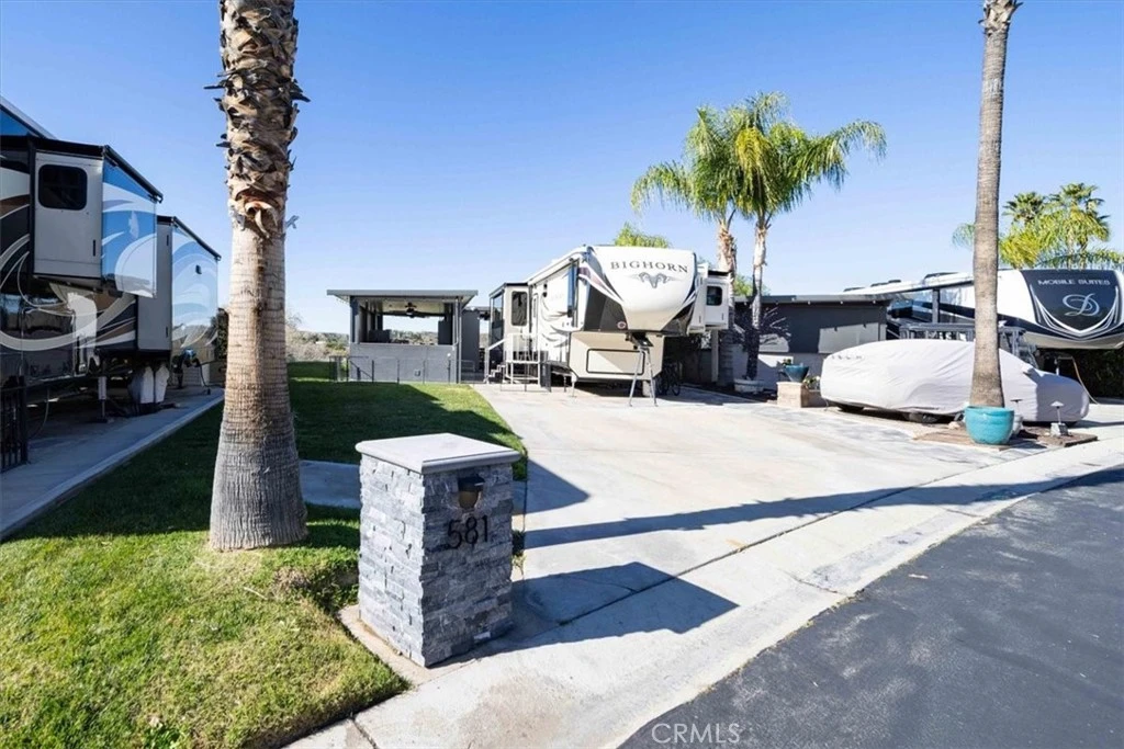 Situated on a massive private lot, this stunning Alumawood and stucco structure delivers an exceptional indoor-outdoor living experience. The expansive buildout features gorgeous residential-style flooring throughout, a full residential kitchen with refrigerator, stove, oven, dishwasher, and beautifully crafted cabinetry, plus an oversized island topped with fantastic countertops—perfect for entertaining. Ceiling fans enhance comfort year-round, while the thoughtfully designed layout includes a dedicated dining area, family area, and a spacious kitchen that feels like home. Step outside to enjoy breathtaking mountain views and unforgettable sunset skies from the large patio, ideal for hosting gatherings or relaxing evenings. The property is fully fenced for privacy and includes a low-maintenance artificial grass area, offering both beauty and functionality. This is a rare opportunity to own a private, turnkey retreat that blends residential comfort with resort-style outdoor living.Rancho California RV Resort enriches your lifestyle with a host of top-tier amenities. Owners enjoy a 14-hole executive par-3 golf course at no extra cost, along with access to five pools and jacuzzis, tennis and pickleball courts, a dog park, two clubhouses, a fitness center, a fishing pond, horseshoes, and a bocce ball area. The resort is guard-gated with no age restriction, ensuring a welcoming environment for all. Monthly HOA fees cover unlimited use of the golf course, all amenities, trash pickup, and water, sewer, and common area maintenance. With financing available, the RV Resort offers the perfect blend of a private property lifestyle and a vibrant community atmosphere.
