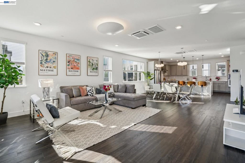 Stylish Alameda's Bay 37 community. Built in 2021, this smart home is fully detached 3 level corner location boasting lots natural light. Features 4 bedrooms, 3.5 baths and 2,400 sq/ft of living space with a 2-car garage (EV-charger ready) Upgrades include solar panels, premium flooring, stylish new lighting and plantation shutters, this all-electric, air-conditioned. The ground level features an ensuite bedroom and entry. The expansive main living level, with 9-ft ceilings, includes a large kitchen with a 36-inch induction cooktop, stainless appliances, quartz counters, a large island and pantry. The dining and living areas are bathed in natural light and open to a spacious front deck. Upstairs, enjoy a coveted layout with 3 bedrooms, 2 baths and side-by-side laundry. Its greenbelt location is ideal for walks with your furry friends, a bike ride or a stroll. This home is a 5-minute walk to Alameda Landing's shopping (w/ popular destinations like Target, Safeway, Jollibee & In-N-Out) and 3 minutes to the free boat shuttle to Jack London Square.