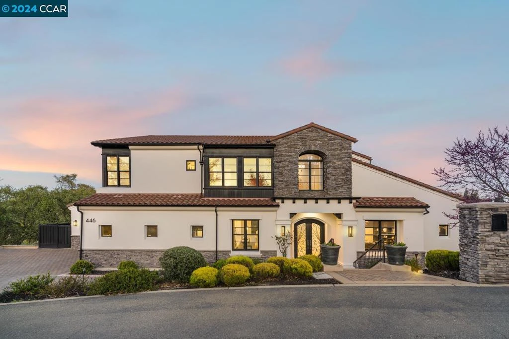 Tucked away in the exclusive gated community of Alamo Ridge, this exquisite home sits proudly on a 3.19 acre lot, commanding spectacular unobstructed views of Mt. Diablo and the valley. With over 6000 sq ft of living space, the gorgeous interior features include a grand foyer, natural French? oak flooring, private study, great room with soaring beamed ceilings, walk-in wine cellar and butler’s pantry. The luxurious chef’s kitchen offers white cabinetry, high-end Thermador stainless steel appliances, oversized center island with bar seating, travertine floors, large walk-in pantry and breakfast nook. The primary suite includes an oversized custom walk-in closet, spa-like bathroom with freestanding soaking tub, walk-in shower, & elegant dual vanities. Upstairs, there are four generous bedrooms, three full baths, and a large home theater with an adjoining entertainer's kitchenette. The backyard, perfect for entertaining, features an outdoor pavilion and hot tub to take in the amazing views. Private and secluded from neighbors, but still close to town, this wonderful home is in the top rated San Ramon Valley School District, and just a short drive to Alamo, Danville and Walnut Creek.
