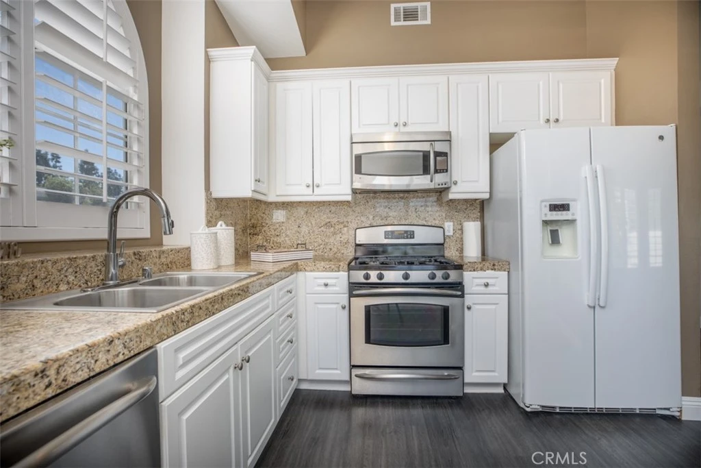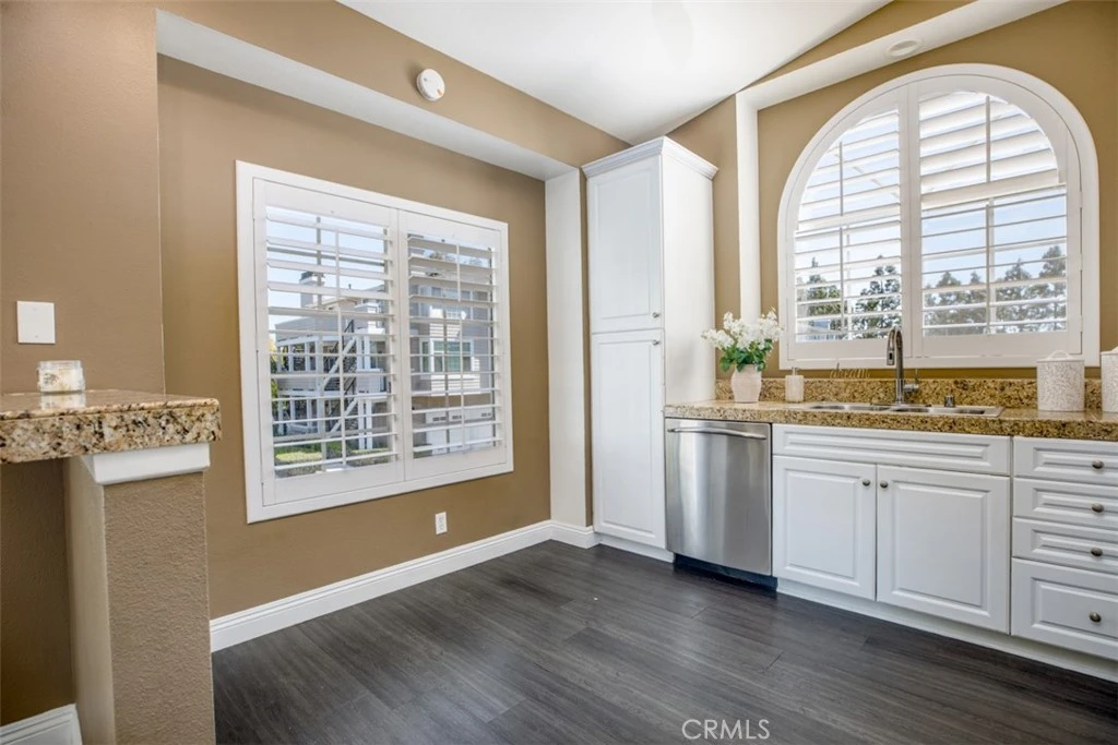 Welcome to Canyon Villas in Aliso Viejo! This beautifully updated, single-level 1-bedroom, 1-bath, end unit is ideally located in a prime interior location just steps from the pool, spa, and fitness center. Light and bright with soaring cathedral ceilings and interior shutters throughout, this upper-level condo offers an open-concept floor plan with upgraded flooring. The upgraded kitchen features granite countertops, stainless steel appliances, white cabinetry, and a decorative backsplash—perfect for both everyday living and entertaining. The spacious primary bedroom includes vaulted ceilings, a mirrored and generous walk-in closet, custom built-ins, while the bathroom has been tastefully updated with a gorgeous walk-in shower. Enjoy relaxing on your private balcony, complete with a convenient laundry closet with full-size washer and dryer. A detached one-car garage adds exceptional value and storage. Canyon Villas offers resort-style amenities including two swimming pools, spa, fitness center, clubhouse, and BBQ. Conveniently located near the 73 Toll Road and the 5 Freeway, with easy access to shopping, dining, entertainment, and just minutes from the beautiful beaches of South Orange County. Perfect for first-time buyers, downsizers, or investors—this turnkey is a must see!