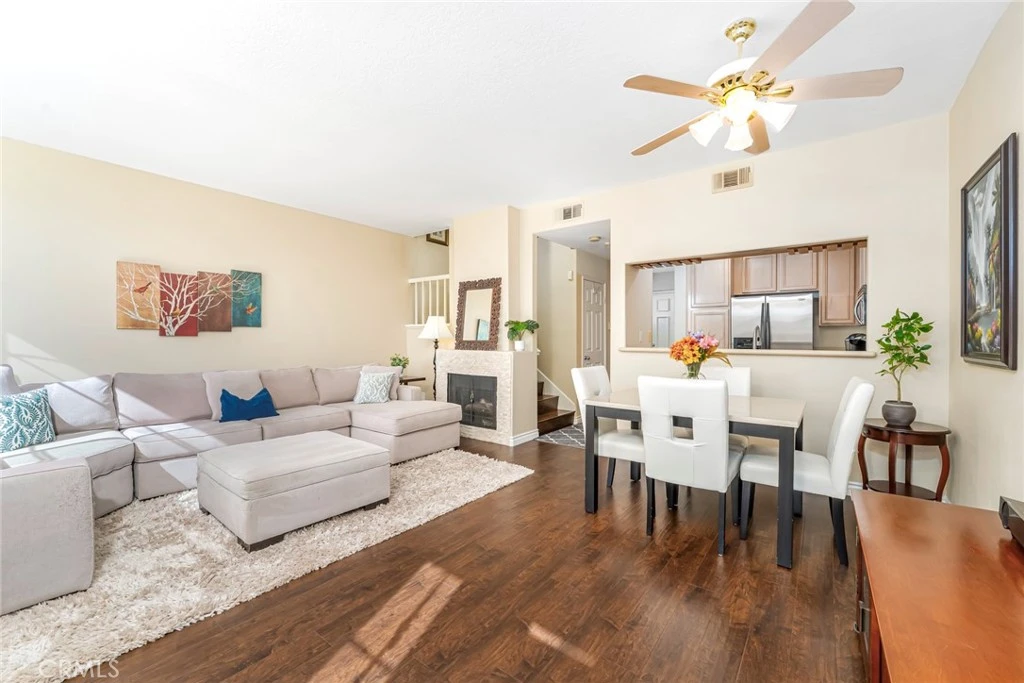 Model perfect & panoramic city lights views! Awesome & open floor plan offering a large living room with large windows & stack-stone surround fireplace and dining room area with ceiling fan light fixture. Gourmet kitchen opens up to the living area and features quartz countertops, upgraded stainless steel appliances, recessed lighting, custom wine glass racks and walk-in pantry with added shelving. Upgrades include laminate wood floors & custom baseboards, six-panel doors, two tone interior paint, mirrored closet doors & more. Wood-accented staircase leads to a large landing with linen closet and dual doors unveiling an over-sized master suite offering raised fireplace, cathedral ceilings with ceiling fan light fixture, large walk-in closet plus 2nd closet & French door access to private balcony with panoramic hills & city lights views. 2-car attached garage with upgraded sectional garage door & overhead storage, large front patio area. The residence is situated within a gated community. Attention has been paid to items such as, new water heater, newer carpet, flooring and paint. When it's time to step out, the community offers an array of amenities to enjoy, including a pool, spa, barbecue, play area, sport court with tennis, pickleball, basketball, and meandering walking paths. Located with incredibly convenient access to the 73 toll road, this home is just a short drive from picturesque parks, scenic biking trails, and the soothing sands of nearby beaches. Shopping enthusiasts will delight in the proximity to the new 99 Ranch, Trader Joe's, lots of Great Restaurants, entertainment, Tesla charging stations, and much more.