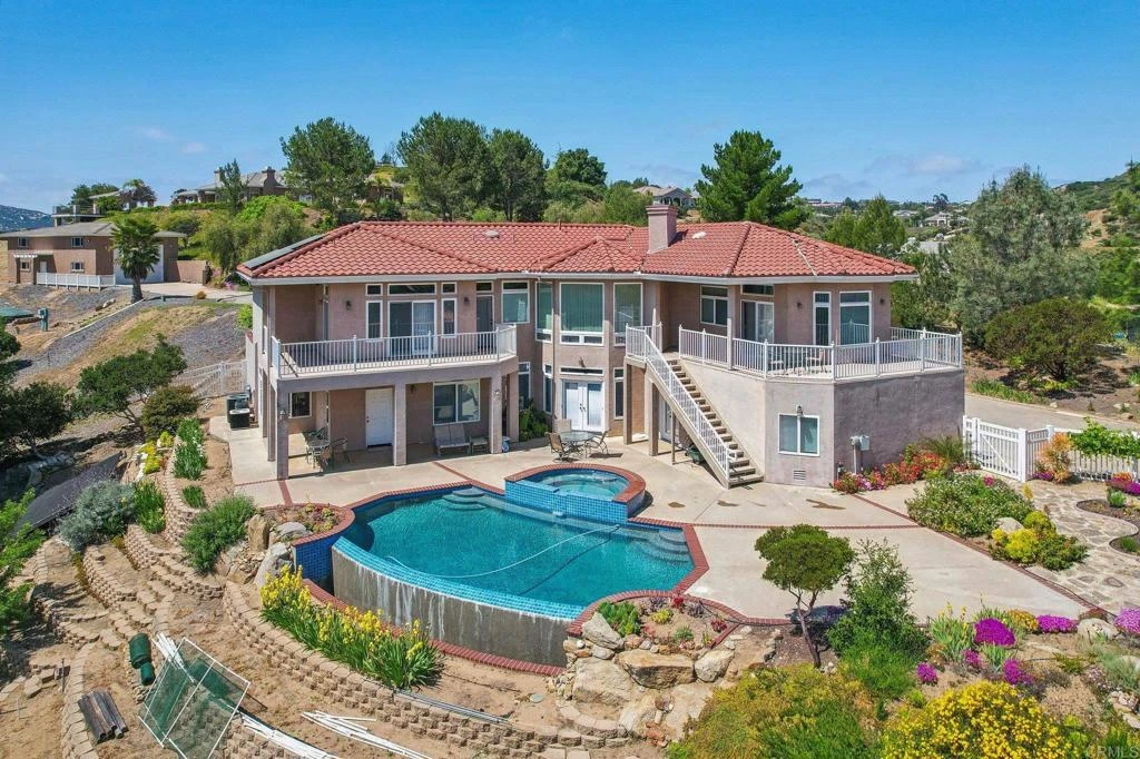 Stunning luxury residence in Rancho Palo Verde features heated vanishing edge pool and spa with breathtaking mountain views. This home is set on a picturesque lot with a vineyard and fruit trees, offering a serene backdrop of the Cleveland National Forest and Sweetwater River. Inside, enjoy the covered courtyard entry, airy elevated ceilings with large windows, two gas fireplaces. The gourmet kitchen includes a large island with butler sink, compactor, electric cooktop, double oven, melamine pressed birch cabinetry with adjustable shelves, and a pantry with a dumbwaiter to the garage. The kitchen opens to a deck with a propane plumbed BBQ area and access to water and electric. The primary bathroom features a wrap-around block shower, built-in laundry chute, jetted soaking tub, double sinks, and a vanity area. A large walk-in closet with built-ins connects the bedroom and bath. Downstairs, the great room has double doors leading to the pool and yard, and includes a wine cellar off the wet bar with a sink, refrigerator, microwave, and an outlet for a stovetop. The 3-car garage offers large walk-in storage and double doors to the backyard. Indulge in the exclusive amenities of this highly coveted community with convenient pickleball and tennis courts, a clubhouse, equestrian trails, and a gated entrance with attendants. Also included is access to Palo Verde Ranch’s private lake which is ideal for fishing, swimming, and boating, a clubhouse and fitness center. Experience the perfect blend of luxury and nature in this exquisite Rancho Palo Verde home.