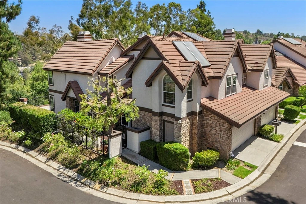 Highly desirable luxury townhome, end unit with northern views, located in the Royal Circle Villas. The property is situated in a tranquil community surrounded by lush gardens and scenic views. Step inside this unique chateau-style home, filled with warmth and charm. The kitchen is a chef’s dream, featuring an upgraded induction cooktop, a highly desirable Thermador hood, stone countertops, stainless steel appliances, a walk-in pantry, and beautiful cherry wood cabinetry with custom storage. The main floor boasts a large living room with a soaring ceiling, a fireplace, and a Juliet balcony overlooking it from upstairs. Additionally, there is a spacious family room on the main floor that includes a wet bar and a second fireplace. Both the living room and family room offer stunning north views and access to a large patio yard that wraps around the home to the front entry gate. A half bath is also conveniently located on the main floor. The primary bedroom is a dream, featuring a grand living space with vaulted wood ceilings, ample room for a sleeping area, multiple storage chests, a retreat area, and a large walk-in closet. The primary bathroom has been upgraded with stone countertops, accent mirrors and includes a soaker tub, plus a separate shower with a skylight above. The two additional bedrooms are separate from the primary bedroom, ensuring privacy for all. Both are grand in size with gorgeous soaring wood ceilings and large closets. The upstairs hall bath has dual sinks, perfect for a shared space. This home exudes charm and includes amenities such as soaring wood ceilings, new AC, a newer water heater, an oversized garage with plenty of storage space, a gated front door area, and a patio yard that wraps around the property. The HOA offers a pool and spa, and the location is minutes from Anaheim Hills Golf Club, with easy access to highways 91, 241, and 55. It is also within walking distance to a local shopping center.