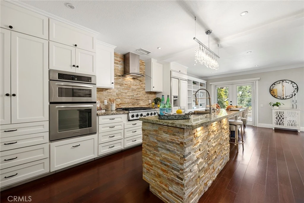 This Stunning, Royal Circle Village attached view home boasts a grand outdoor entertainment patio, perfect for gatherings. Upon entering, vaulted ceilings and large windows flood both levels with natural light. The main floor features beautiful solid hardwood floors that flow seamlessly through the open living space. The spacious living room centers around a striking stone fireplace, enhanced by custom lighting. The kitchen is a designer's dream, complete with high-end stainless-steel appliances, a built-in refrigerator, a six-burner cooktop, custom cabinetry, gorgeous stone countertops, and an elegant kitchen island. The dining area, adjacent to the kitchen, comfortably accommodates extended seating. Three sets of French doors lead to the expansive back patio, offering a true indoor-outdoor lifestyle. The patio features a gas fire pit, with room for multiple seating areas, making it ideal for entertaining. Both bedrooms are large suites with fabulous, vaulted ceilings. The primary suite offers a scenic golf course view and a luxurious bathroom with dual sinks, a walk-in shower with a seamless glass door, and multiple closets with custom mirrored doors, and a grand amount of storage. The secondary suite is equally impressive, featuring a private bath with a large soaking tub, separate shower, and a large walk-in closet. Thoughtful details and endless custom storage throughout make this home truly unique. Additional features include newer AC/HVAC, newer windows and doors, a new electrical panel, a car charger outlet, custom garage storage, northern view, and a bit of golf course views. Conveniently located near the HOA's pool and spa, shopping, dining, Anaheim Hills Golf Club, and major highways (241, 91, 55), this home offers both luxury and accessibility.