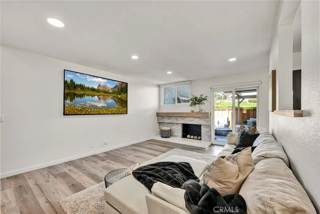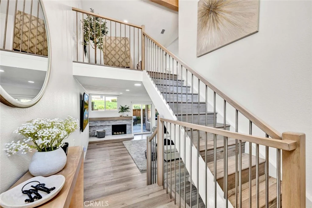 Beautifully remodeled single-family attached home in the highly sought-after Parkview community of Anaheim Hills, ideally located adjacent to the Anaheim Hills Golf Course. Offering approximately 1,550 sq. ft., this light-filled residence features 3 bedrooms and 3 bathrooms with a thoughtfully updated, open-concept floor plan. The main level includes a bedroom and a full bathroom with dual access from both the hallway and bedroom. The fully remodeled kitchen showcases white shaker cabinetry, white quartz countertops, subway tile backsplash, stainless steel oven, and a sleek black vent hood, seamlessly opening to the dining area—perfect for everyday living and entertaining. The living room features a remodeled stone fireplace with hearth, recessed lighting, and new windows throughout, enhancing the home’s bright and modern feel. Upstairs offers a spacious loft area and two additional bedrooms, including the primary suite with double door entry and custom closet organizers. Each upstairs bedroom features its own private vanity area, while sharing a centrally located shower and toilet room, providing both privacy and functionality. Both vanities have been tastefully updated with white oak cabinetry, quartz countertops, and modern lighting. Additional upgrades include new light oak laminate flooring throughout, recessed lighting, and an updated staircase. The backyard features a covered patio with concrete slab, ideal for outdoor enjoyment. The home also includes a 2-car attached garage with direct access, with laundry conveniently located in the garage. Residents enjoy access to community pool, lush greenbelts, and mature trees.