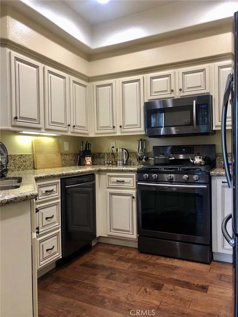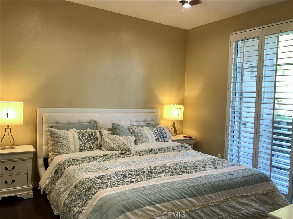 Desirable Ground-Floor 2-Bedroom Condo in Gated Viewpointe North. Beautifully updated ground-floor two-bedroom, two-bathroom condo located in the highly sought-after gated community of Viewpointe North. This popular floor plan offers no interior steps and a spacious private patio extending from the living room to the primary bedroom — ideal for indoor-outdoor living. The inviting living room features wood-laminate flooring, a remodeled fireplace, recessed lighting, plantation shutters, and a sliding glass door providing direct patio access. The remodeled kitchen showcases granite countertops, custom cabinetry, recessed lighting, stainless steel appliances, updated sink and faucet, and includes a stainless steel refrigerator. The primary suite offers wood-laminate flooring, sliding glass door to the patio, a beautifully remodeled bathroom with dual-sink vanity and walk-in shower, plus a generous walk-in closet. The sizable guest bedroom is complemented by an updated guest bathroom with bathtub/shower combination. Additional features include a convenient indoor laundry closet suitable for a full-size washer and dryer, an attached one-car garage with direct access, and an additional covered carport nearby. Viewpointe North residents enjoy resort-style amenities including two pools, spas, and a clubhouse, all within a gated setting. Ideally located within walking distance to hiking and biking trails, parks, and award-winning Anaheim Hills Elementary.