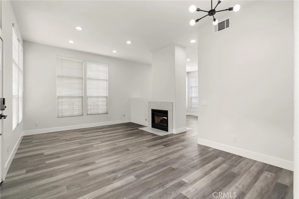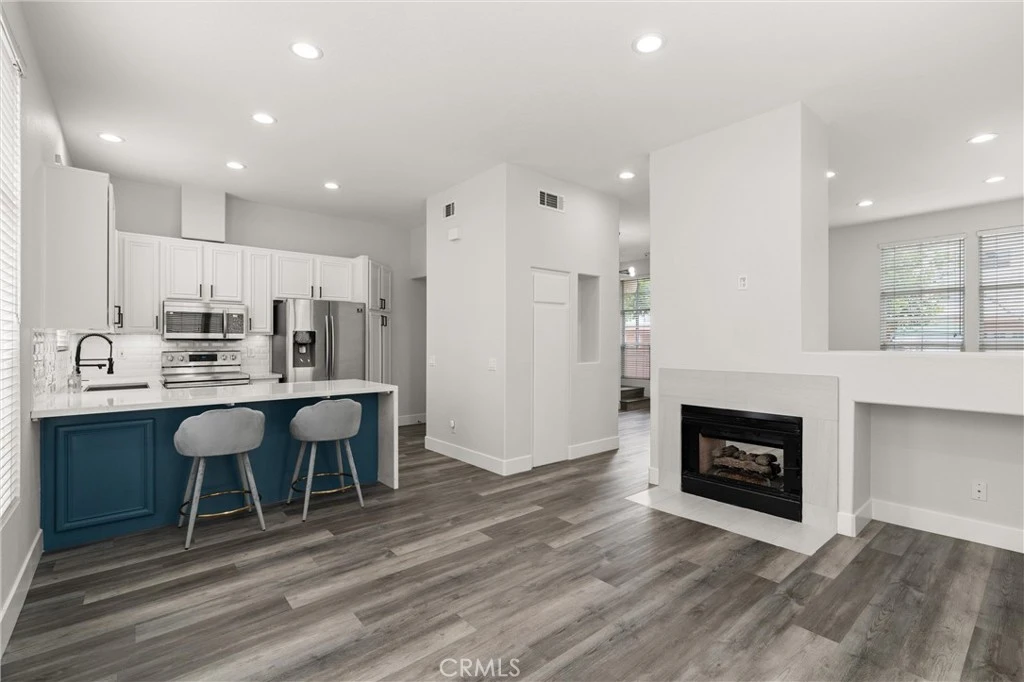 Welcome to the largest floor plan available in the highly sought-after, quiet, and gated Summit Renaissance Community. This end-unit townhome has been thoughtfully upgraded throughout, offering both style and functionality. Step inside through a smart front door lock into a bright and open main living area featuring luxury vinyl plank flooring, 5-inch baseboards, fresh paint, and a stunning remodeled dual-sided fireplace. The layout seamlessly connects the den, dining area, family room, and kitchen—ideal for modern living and entertaining. The remodeled kitchen showcases a sleek waterfall-edge quartz countertop, a full subway tile backsplash, and stainless steel appliances. Custom-finished cabinetry includes matte black hardware and soft-close mechanisms, complemented by a large farmhouse sink for both beauty and utility. Just off the kitchen is a stylishly upgraded half-bathroom and direct access to the attached two-car garage. A whole-home water filtration system ensures clean, treated water throughout every tap in the house—perfect for healthy living, soft water, and peace of mind. Upstairs, you’ll find a completely carpet-free second level. The expansive primary suite is a standout, featuring both a walk-in and sliding closet, and a beautifully remodeled en-suite bathroom. The upgraded shower features sleek tile work, modern black fixtures, and a seamless glass enclosure. Dual sinks are set in an expansive quartz slab, complemented by elegant ceramic tile flooring and coordinated cabinetry. Two additional bedrooms share a convenient Jack-and-Jill bathroom, ideal for families or guests. Located within the prestigious Orange Unified school district and nestled in a peaceful, gated community, this smart, clean, and sophisticated home offers upscale living in one of Orange County’s most desirable neighborhoods.