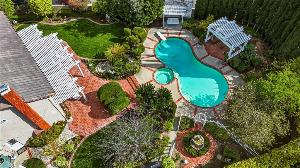 First time on the market since the 1970s, this cherished Anaheim Hills home sits on an extraordinary 14,250 sq. ft. garden property that has been featured multiple times on the renowned Mary Lou Heard Memorial Garden Tour. Located on a quiet cul-de-sac in the lush Anaheim Hills community known for its mature, towering pine trees, this 2,922 sq. ft. residence offers 3 bedrooms, 3 bathrooms, a 3-car garage and a large upstairs bonus room that many homeowners convert into two additional bedrooms, creating a potential 5-bedroom home. The inviting floor plan includes a formal living room, formal dining room, and a comfortable family room with a classic brick fireplace. The remodeled kitchen with center island opens nicely to the family room, making it ideal for both everyday living and entertaining. The downstairs level features beautiful gray porcelain tile flooring designed to resemble wide wood planks, along with a bathroom with shower and an indoor laundry room. Additional upgrades include a tankless water heater. Upstairs, all bedrooms are privately situated, including the spacious primary suite with dual sinks, a soaking tub and serene views overlooking the spectacular backyard gardens. The upstairs bathroom has been recently remodeled, and the oversized bonus room provides tremendous flexibility for additional bedrooms, a media room, or game room. The backyard is truly a private garden retreat. The stunning grounds—featured several times on the Mary Lou Heard Memorial Garden Tour—showcase mature specialty trees, fruit trees, vibrant flowering gardens, a tranquil koi pond, and a peaceful fountain. Designed for outdoor enjoyment, the yard also includes brick and concrete hardscaping, a patio cover, pool and spa and there are multiple raised wood planter beds specifically made for vegetable and herb gardens. Located near the Anaheim Hills reservoir with nearby hiking and biking trails, this exceptional property offers natural beauty, privacy, and space—all with no HOA. Homes with this much history, garden beauty, and pride of ownership rarely become available in Anaheim Hills.