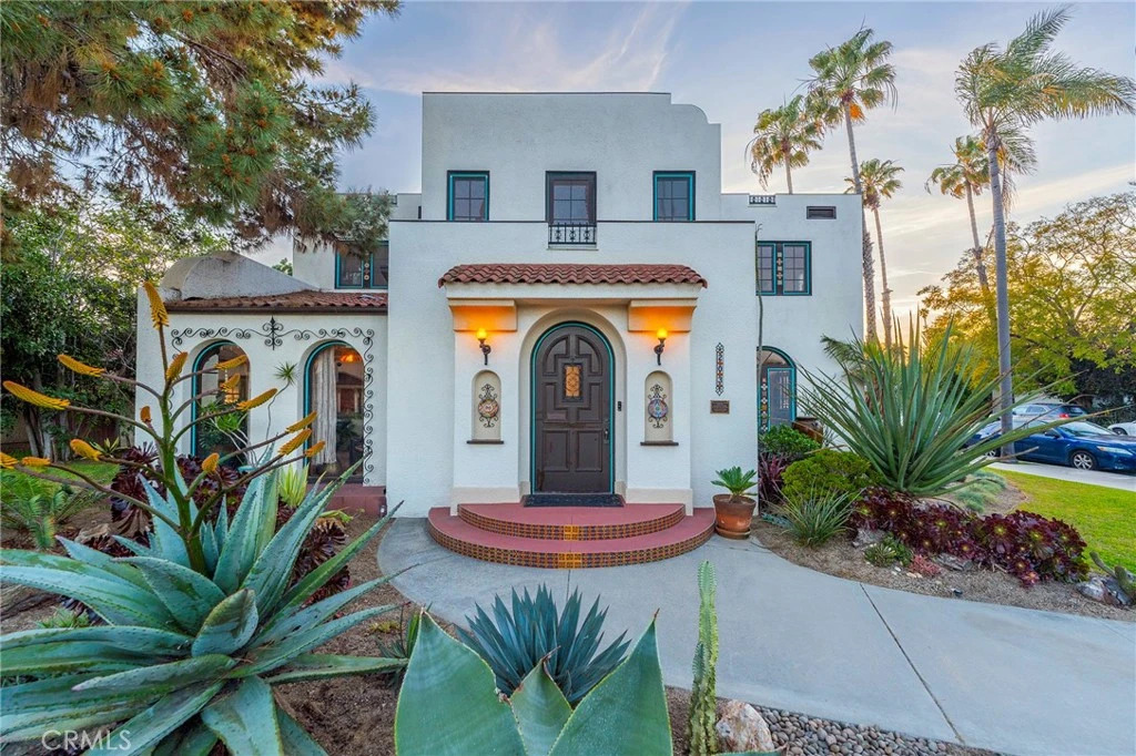 Welcome to the Schneider-Beach House, a breathtaking testament to Spanish Colonial Revival architecture nestled in the heart of Anaheim's historic 5 Points district. This is a rare opportunity to own a piece of history and architectural splendor. From the moment you lay eyes on this stunning property, you'll be captivated by its timeless charm. Adorned with arched windows, intricate wrought ironwork, and meticulously landscaped gardens featuring drought-tolerant plants, the curb appeal is simply unparalleled. Step inside and prepare to be enchanted. The formal entryway sets the tone with its venetian plaster walls, arched casement windows, and an exquisite iron staircase—a mere glimpse of the grandeur that awaits. Every corner of this home exudes elegance and craftsmanship. French doors, period-appropriate fixtures, and artisanal finishes tell a story of a bygone era preserved with care over the decades. The expansive living room beckons with its rare Batchelder tile fireplace and French doors leading to the courtyard, seamlessly connecting indoor and outdoor living. Adjacent, the formal dining room boasts French pocket doors, creating an ambiance of refined sophistication. For added convenience, a studio apartment awaits, offering a private retreat with a full kitchen and bath—ideal for guests, relatives, or rental income, with potential monthly earnings of $1800-$2000. Financially savvy buyers will appreciate the property's Mills Act designation, ensuring low property taxes of just $4024 per year, a rare benefit for a home of this caliber. The kitchen is a culinary dream, featuring custom cabinets, solid wood counters, and vintage-inspired appliances complemented by modern conveniences. Natural light floods the space, illuminating every detail, while the adjacent breakfast room offers a tranquil escape with French doors opening to the courtyard oasis. Upstairs, four spacious bedrooms await, including a primary suite with a private bath, walk-in closet, and balcony access—perfect for enjoying tree-lined views and Southern California sunsets. Situated on a corner lot, this property offers ample parking space, including room for RVs or boats, and the potential for future expansion or a second home. Don't miss your chance to own a piece of Anaheim's history. Schedule a tour today and experience the timeless allure of the Schneider-Beach House for yourself.