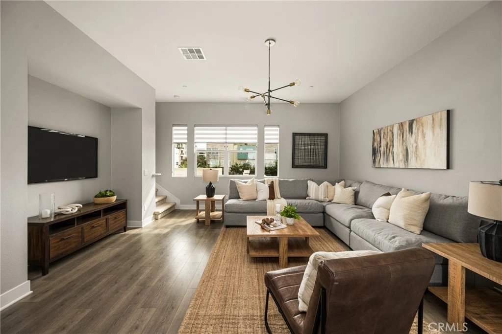 Turnkey Modern Townhome in the heart of Anaheim’s Platinum Triangle featuring 3 Bedrooms plus a Den, a PRIVATE ROOFTOP DECK, and a direct-access 2-car garage. Ideal for a first-time buyer or investor, with strong rental potential of approximately $4,300 per month. Tucked toward the back of the community, the home offers enhanced privacy in a prime location. The thoughtfully designed floor plan begins with a Den and Powder Room upon entry, providing flexible space for a Home Office, Gym, or sitting area. The Second Level showcases an expansive, light-filled Great Room with high ceilings and walls of windows that flood the space with natural light. The open Chef’s Kitchen is designed for entertaining and features white shaker cabinetry, quartz countertops, a white subway tile backsplash, stainless steel appliances, and an oversized island that flows seamlessly into the Dining Area and Great Room. The Third Level offers 3 generously sized bedrooms, including a luxurious Primary Suite with a spa-inspired bathroom, dual vanities, walk-in shower, and a large walk-in closet. secondary bedrooms are thoughtfully positioned at the opposite end of the hall and share a spacious guest bathroom with a soaking tub. Laundry is conveniently located on this level. Escape to the Oversized Private Rooftop Deck to enjoy stunning City and Pool Views. Perfect for relaxing, entertaining, and stargazing, this space truly elevates the home. Energy-efficient features include EV charging, a tankless water heater, and a dual HVAC system. Located just minutes from Disneyland, the Honda Center, Angels Stadium, the exciting OCVIBE development, and major freeways. Modern living, low maintenance, and an unbeatable location that puts you right in the center of it all. This is a must-see.