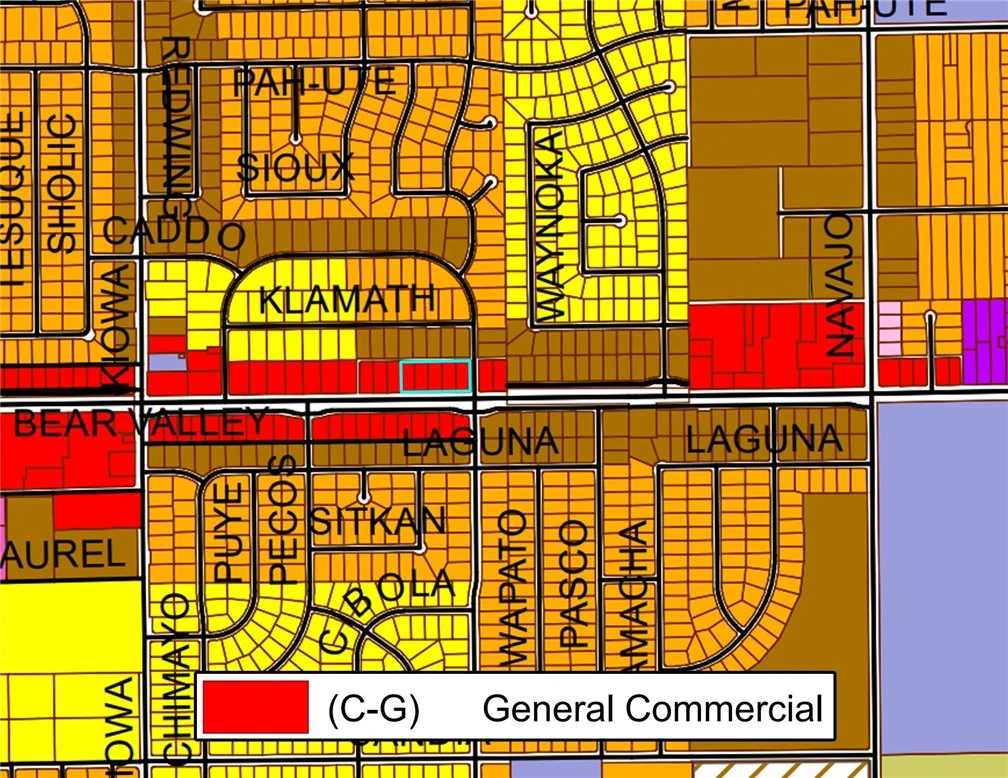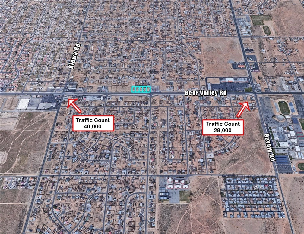 2.69 ac Commercial signalized corner on Bear Valley Rd in Apple Valley. Located on the Northwest corner of Bear Valley Rd and Multnomah Rd, central between Kiowa Rd and Navajo Rd. Bear Valley Rd and Kiowa Rd has a traffic count of almost 40,000 per day. Bear Valley Rd and Navajo Rd has a traffic count of almost 29,000 per day. Highly traveled segment of Bear Valley Rd in Apple Valley. Over 2,000 residences in a 1 mile radius, over 6,400 in a 2 mile radius. Zoned C-G (General Commercial), allowing for retail, office, gas station, shopping center, auto repair/sales, restaurants, etc.