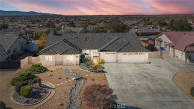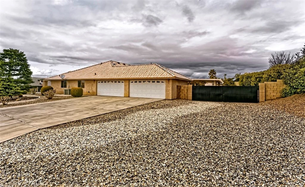 Spacious and thoughtfully designed, this 3,640 sq. ft. split floor plan home offers 5 bedrooms and 3 bathrooms on a generous 20,000 sq. ft. corner lot with beautiful southwest-facing views and exceptional curb appeal. A grand entrance welcomes you with a circular driveway and extensive concrete work, creating both convenience and an impressive first impression. The side-entry 4-car finished garage adds architectural appeal and includes built-in storage cabinets, garage door openers, and dedicated counter space ideal for workshop or hobby use. This home has been gently lived in and reflects pride of ownership throughout, showing no hard wear. Tile and carpeted flooring provide a balance of comfort and durability, while tile countertops in the kitchen, bathrooms, and laundry room offer style and easy maintenance. The expansive kitchen features a large center island, abundant cabinetry, and extensive pantry storage with pull-out shelving for easy access. It opens seamlessly to the great room, making it perfect for entertaining and everyday living. A cozy dining nook provides casual dining space, while the formal dining room is ideal for special gatherings. A separate office offers privacy and flexibility for remote work or study. The private primary suite serves as a true retreat with its own fireplace and direct access to the large covered patio—perfect for enjoying cool summer evenings. The primary bath includes dual vanities, a spacious accessible closet, private water closet, soaking tub, and an oversized double step-in shower. In addition to two generously sized secondary bedrooms with exterior access, the home includes two more comfortable secondary bedrooms, offering flexibility for family, guests, or additional workspace. Additional highlights include an indoor laundry room with storage, counter space, tile countertops, and a wet sink, along with abundant storage throughout. An RV gate provides secured behind-the-fence parking with electrical hookups. The backyard is thoughtfully designed for relaxation and entertaining, featuring a covered open-air cabana with solid flooring, a tranquil waterfall feature, a matching storage shed, and high privacy walls enhanced by mature foliage. Offered at a price aligned with current FHA loan limits for San Bernardino County, this home presents exceptional space, functionality, and value.