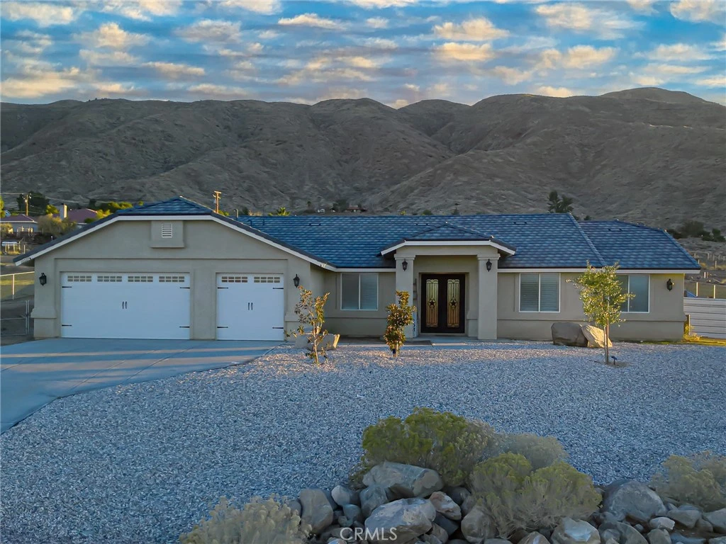 Welcome home to the perfect blend of luxury and wide-open country living in Apple Valley. This 2021-built beauty sits on over an acre of usable land and captures the heart of the desert with spectacular sunrises and sunsets, mountain backdrops, and room for horses and farm animals. Spend your days relaxing in the custom saltwater pool and spa, hosting gatherings on the spacious deck, or enjoying quiet moments in your beautifully designed outdoor spaces. The front yard offers low-maintenance beauty with custom rock landscaping, trees, and elegant night lighting. Inside, every detail shines - 4 spacious bedrooms, 2.5 impeccable appointed baths, and 2089 sq. ft. of living space. This home boasts plush bedroom carpeting, premium waterproof wood-look flooring, designer lighting, lovely shutters throughout and a custom front door that elevates curb appeal. The gourmet country kitchen shines with quartz countertops, black stainless steel appliances, a large island, and custom cabinetry with abundant storage. Retreat to the luxurious master suite with a soaking tub, walk-in shower, dual sinks, and stylish black finishes. The oversized 3-car garage with ample lighting, concrete pathways connecting the garage and outdoor spaces rounds out this exceptional property. A TRUE ENTERTAINERS DELIGHT—YOUR DESERT DREAM AWAITS!