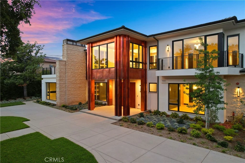 Discover the epitome of luxury living in this over 11,000-square-foot contemporary modern estate, built by Bowden Development, Designed by Robert Tong and interior designed by Ilustracion by Jake. Nestled in the prestigious "Upper Rancho" area of North Arcadia. This architectural masterpiece sits on an expansive 33,000-square-foot lot and includes a separate guest house featuring a living room, kitchen area and full bathroom.. Step through the beautiful wood pivot front door into a grand foyer with cathedral ceilings, setting the tone for the home's high ceilings throughout. The property boasts a striking contemporary design with a copper facade, ensuring it stands out with elegance and sophistication. Entertainment options abound with a huge movie theatre and an expansive gym complete with a bathroom and sauna. The outdoor amenities are equally impressive, featuring a pool and spa with cascading waterfalls. Work from home in style in the executive office, which includes a cozy fireplace. Retreat to the grand master suite that stretches from the north to the south side of the property, offering balconies on both ends for breathtaking views. Each upstairs bedroom also features its own balcony, providing private outdoor space for everyone. The kitchen is a chef's dream, equipped with high-end appliances and a spacious nook overlooking the beautifully landscaped backyard. The home is adorned with contemporary chandeliers and backlit onyx in the wine room, adding to its sophisticated charm. LED lighting throughout the house enhances its modern appeal. This estate is a rare find, combining luxury, functionality, and contemporary design in a prime location.