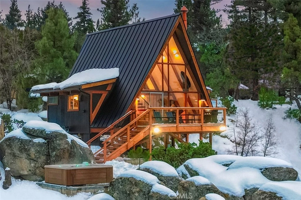 The Lake Arrowhead/Big Bear region is synonymous with A frames. A-frames are reflections of the mountains they inhabit; snowed in, Après Ski, and Summer pine aromas. This A Frame sits at a pinnacle, capturing unbridled views. Built in 1964 as a price for a Heinz 57 sweepstakes winner. Then, in 2022, the structure was brilliantly restored showcasing precision in spatial planning, material integrity, and modern-rustic synergy. Herringbone hardwood floors draw the eye across the room like an arrow, up to the full frame windows and out to the sky, boulders, and forest. The kitchen is smart, with a full suite of appliances including retro Classic brand fridge, gas stove and microwave, water filter, dishwasher and hidden laundry facilities. The counters are quartz river stone terrazzo, and an elegant steal reenforced floating waterfall edge serves as a dining setting, bar, prep or laundry station. The sofa is faced directly at the twenty-five-foot-tall window. The forest brushing the bottoms of clouds and shifting colors of the sky and phases of the moon and stars are true natural endless entertainment. A vintage Midcentury MALM fireplace ties a whole architectural theme and scheme together. The bath features a walk- in shower with hexagonal tile Aswell as acoustic paneling behind the commode. The basin sink preserves counterspace. And heated floors warm your bare feet all year long. Downstairs is a bedroom for guests, but the bedroom loft upstairs is romantic magic. Ascend a floating staircase to a boudoir where the moon kisses you good night and the light on the trees brushes you to wake. The whole home is smartly lit with warm minimalist sconces providing ample indirect light. You've waited long enough. It's time to make your mountain escape fantasies come true. This property grossed $126,000 in 2024 as an STR