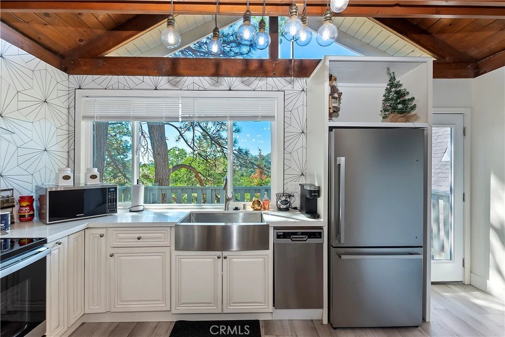 This home is a two bedroom, two bathroom gem in Arrowbear. With upgraded stainless steel appliances, the kitchen boasts modern convenience and fantastic view out the kitchen window. The stunning tree-lined views outside create a serene ambiance, complemented by the vaulted ceilings adorned with open beams in the great room, enhancing the spacious open concept living area. Transitioning seamlessly to a back deck, the home invites you to enjoy the scenic beauty. The two bedrooms are conveniently situated downstairs, accompanied by a beautifully designed bathroom. Located in Arrowbear, this residence serves as an ideal commuter location and a wonderful getaway. Inside, the space is illuminated with ample natural light, further accentuating the beautiful gray tones that give the interior stylish touch. Home is equipped with air conditioning as well.