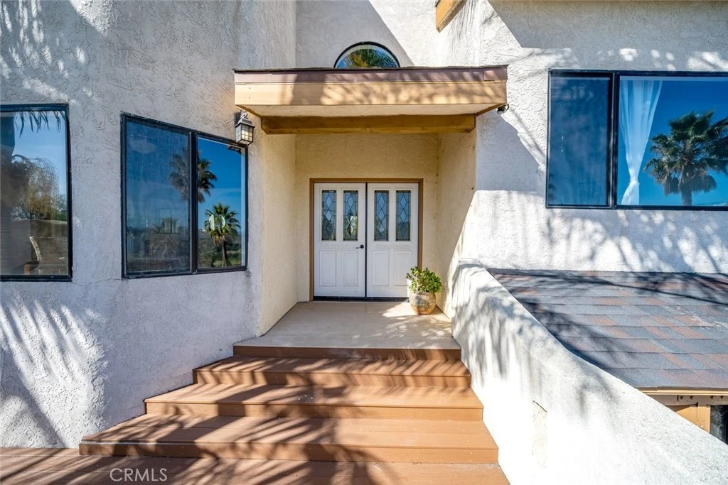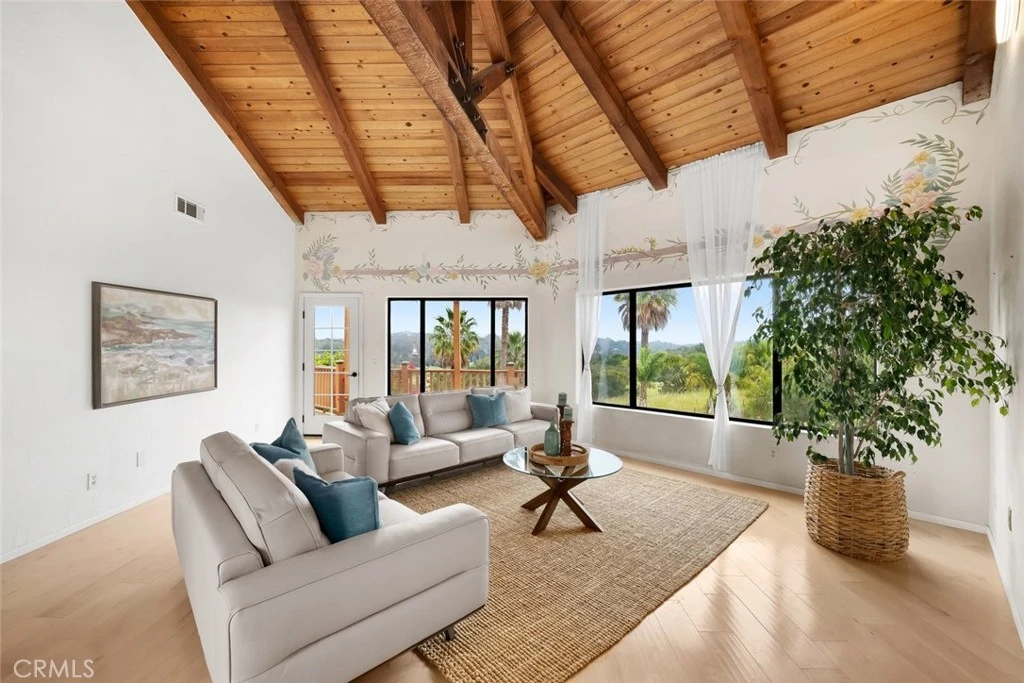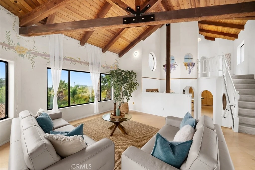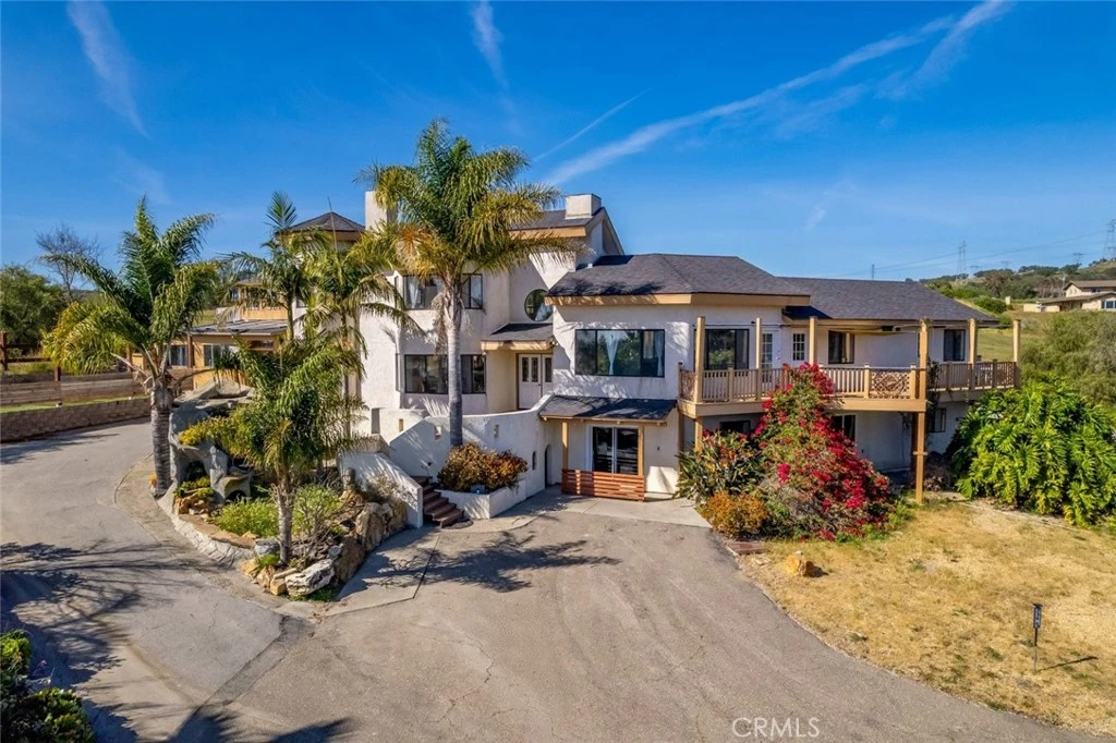 Over $200,000 invested in recent property improvements, including complete interior painting throughout the main house, new flooring in primary living areas, and electrical upgrades. From the gated entrance, fragrant landscaping with succulents, sage, palm trees, and citrus trees creates a warm welcome. Unique hardscape features and a circular driveway center the home within the property, creating a striking arrival. Stained-glass entry doors open to an inviting interior that flows from the dining room to the kitchen and laundry area. The laundry room conveniently connects to both the kitchen and the back porch. The spacious kitchen features tile countertops, modern appliances, abundant cabinetry, and a wet bar with additional storage. A breakfast bar offers extra seating and workspace. The kitchen opens to a dining area with beautiful property views, copper ceiling tiles, and access to the back porch. A charming under-stair storage nook adds functionality. Soaring wood-beamed ceilings bring warmth and natural light throughout the home. A short flight of stairs leads to the primary living room, where expansive windows frame sweeping views of rolling hills and surrounding landscape. Decorative mural artwork adds character, and the room opens to a scenic balcony. Two bedrooms are located just off the living room, both with balcony access. The nearby bathroom includes a dual-sink vanity and a shower/tub with tile surround. Up another short flight of stairs is the private primary suite featuring skylights, a sitting area, and sweeping views stretching all the way to the ocean. The ensuite bath offers a dual-sink vanity, soaking tub, walk-in tile shower, walk-in closet, and private balcony. The converted basement offers a separate two-bedroom, one-bath living space with its own private entrance and laundry—ideal for guests, extended family, or rental potential. Additional features include a pole barn, saloon building, detached three-car garage with mechanic pit, a private well with 500-gallon galvanized steel holding tank, a windmill, and panoramic views. Plus a bonus room above the garage. This unique property offers versatile living spaces, open field views from every window, and endless possibilities in a beautiful scenic setting.