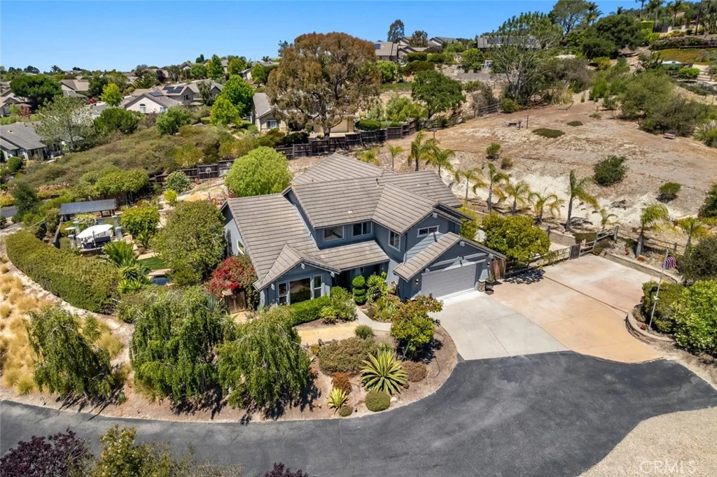 Just the right amount of rural charm, this stunning 5-bedroom, 3.5-bath home sits on 1.38 acres in the coveted Highlands at Rancho Grande in Arroyo Grande. With mature landscaping and exceptional curb appeal, this elegant, functional home offers comfort in a private, peaceful setting. From the moment you arrive, you’re greeted by natural light, arched walkways, and a layout designed for everyday living and entertaining. Upstairs, the luxurious primary suite is a serene retreat featuring a spacious ensuite with dual vanities, jetted tub, walk-in shower, smart defogging mirrors, and a large walk-in closet. Three more bedrooms share a well-appointed full bath, offering flexibility for family, guests, or office space. The main level blends formal and casual living. A bright formal living room with decorative wall niches and recessed lighting overlooks the lush front yard. The chef’s kitchen boasts a large island with storage and sink, gas range with hood, double ovens, and abundant cabinetry. The adjacent dining area features designer lighting, a fireplace with stone surround, custom sideboard with beverage center, and French doors opening to the expansive backyard for seamless indoor-outdoor flow. A spacious family room offers direct backyard access and an attached full bath with dual sinks and walk-in shower. The fifth bedroom is connected to the bath by a private hall—ideal for guests, multi-gen living, or an office. A stylish guest half-bath, dedicated laundry room with folding counter, and a wine cellar complete the main floor. Outside the backyard is an oasis with an in-ground pool and spa, multiple lounge areas, a cabana with space to grill, dining table, and whimsical swinging seats. Enjoy year-round fun with a fire pit and bocce ball court—perfect for relaxing or entertaining. An attached two-car garage, 12'x14' storage shed, and ADU potential rounds out this exceptional home, offering a rare blend of space, design, and indoor-outdoor living in one of Arroyo Grande’s most desirable neighborhoods. A peaceful retreat and entertainer’s dream in one.
