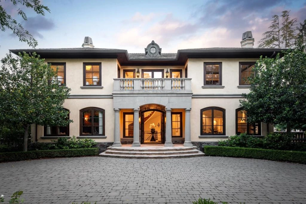 In the heart of Lindenwood, this home evokes romantic elegance with its grand foyer and incredible craftsmanship evident at every turn. The main floor provides a dedicated paneled office with fireplace, formal living room with fireplace and dining room with coved ceiling and tray lighting. The gourmet kitchen features a barrel-vaulted ceiling, top-of-the appliances -Sub-Zero and two dishwashers and fully open to the family room with 12' ceiling, central fireplace and multiple French doors leading to the grounds. Main level primary suite is a sanctuary of luxury with fireplace, huge closet with washer/dryer, large bath with heated floor, steam shower. Upstairs, are four bedrooms, each with a balcony, two with ensuite baths, and two with shared bath. Two additional lower-level bedrooms, one is currently customized as a fitness center, provide versatile living options, each with direct access to a shared bath. Rounding out the lower level is a dedicated home theatre, customized wine cellar, as well as an additional full bath. Park-like grounds with three gated entrances, sparkling pool, and spa with guest house and immense privacy and. 3-car garage. Prime location, excellent Menlo Park Schools, close top rated private schools,shopping, restaurants, and commute routes.