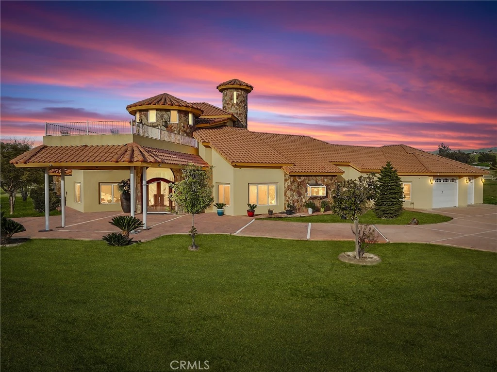 Welcome to this extraordinary 5,500+ sq. ft. estate featuring a four-bedroom, 4.5-bath split-wing floor plan on over six acres. This impressive property includes an office, reading room, and an inviting bar/game room perfect for work and entertaining. Enter through elegant double doors into soaring ceilings and a bright, open living space. The expansive primary suite offers dual walk-in closets, a Jacuzzi soaking tub, and a spa-style shower with multiple jets. All secondary bedrooms are ensuite for added comfort and privacy. The chef's kitchen features upgraded appliances, double ovens, and a large center island. Additional highlights include surround sound, extra water storage, and thoughtful upgrades throughout. Enjoy stunning mountain views and sunsets from the upstairs patio. Outdoors, pipe fencing makes this property ideal for horses or animals, complemented by fruit trees and a large fire pit for memorable gatherings. Luxury, space, and country living!