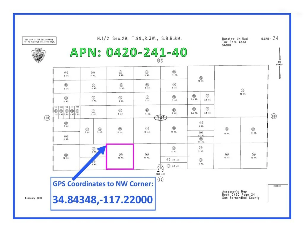 10 Acres (APN: 0420-241-40) GPS: 34.84348, -117.22000 The property is located near Barstow, CA approx 1 mi West of the BNSF 'BIG' project. This property lies within the unincorporated area of the San Bernardino County within the 'Resource Conservation (RC)' zoning. According to the County this land use designation zoning district provides for open space and recreational activities and single family homes. Some of the other permitted uses include; crop production, orchard, vineyard, produce stand and a licensed residential care facility. Nestled at the crossroads of major highways—Interstate 15, Route 66, and Highway 58—Barstow stands as a pivotal destination, aptly earning its nickname as the 'Crossroads of the Desert.' Beyond its charm as a stopover for travelers, Barstow is poised for an exciting future with the groundbreaking BNSF Barstow International Gateway (BIG) project. This transformative initiative positions the city as a key logistics hub, bringing economic growth and new opportunities to the region which will only be 1 mile east of the property. This property does not yet have an address. While the boundary lines on the map offer a glimpse, they are only approximate. A Buyer should verify boundaries, zoning and utilities, ensuring every aspect aligns with their vision for the property.