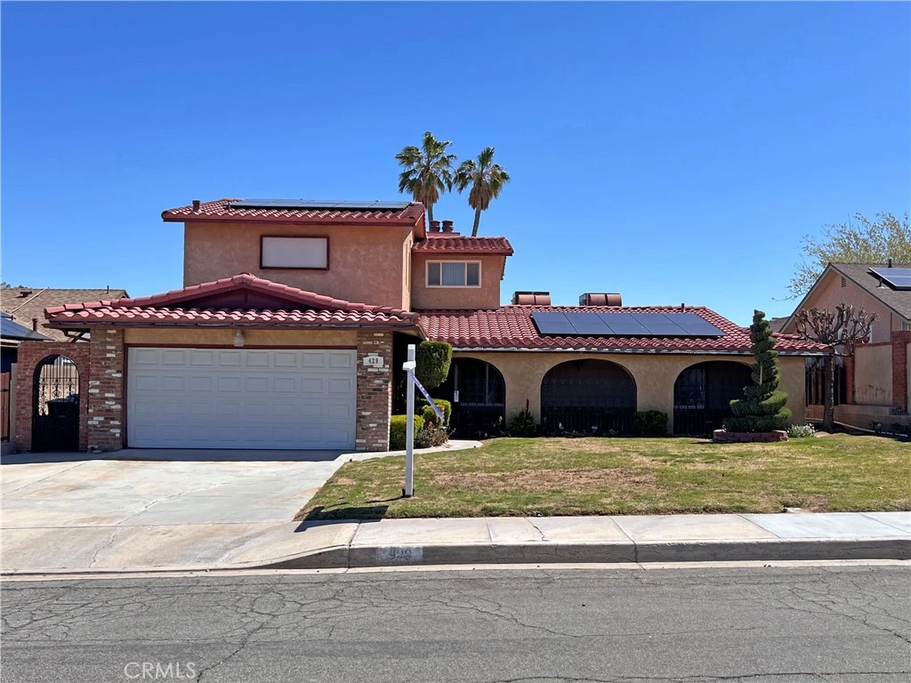 Huge home in the Fashion Square community of Barstow. This two-story with over 2400 square-foot home features, five bedrooms and three bathrooms. Downstairs you will find four bedrooms and two baths, living room, dining room, and small family room connecting to the kitchen. Upstairs is a large primary bedroom with a beautiful un-suite, walk-in closet, double sinks, and huge round spa tub. At the top of the stairs, you will be greeted by a huge, beautiful bonus room, which would make a great home office with custom built-in desk, cabinets, and bookcases. Other amenities include a covered patio, in-ground pool with spa, and there is a huge inclosed cozy and quaint porch on the front of the house. A tile roof was installed on this home approximately five years ago, and there is a 2/3 ton AC unit installed new in 2023. To put the icing on this home it also has paid solar, no lease or financial obligation to a new buyer with 20 panels that produces 12,917 kW yearly.