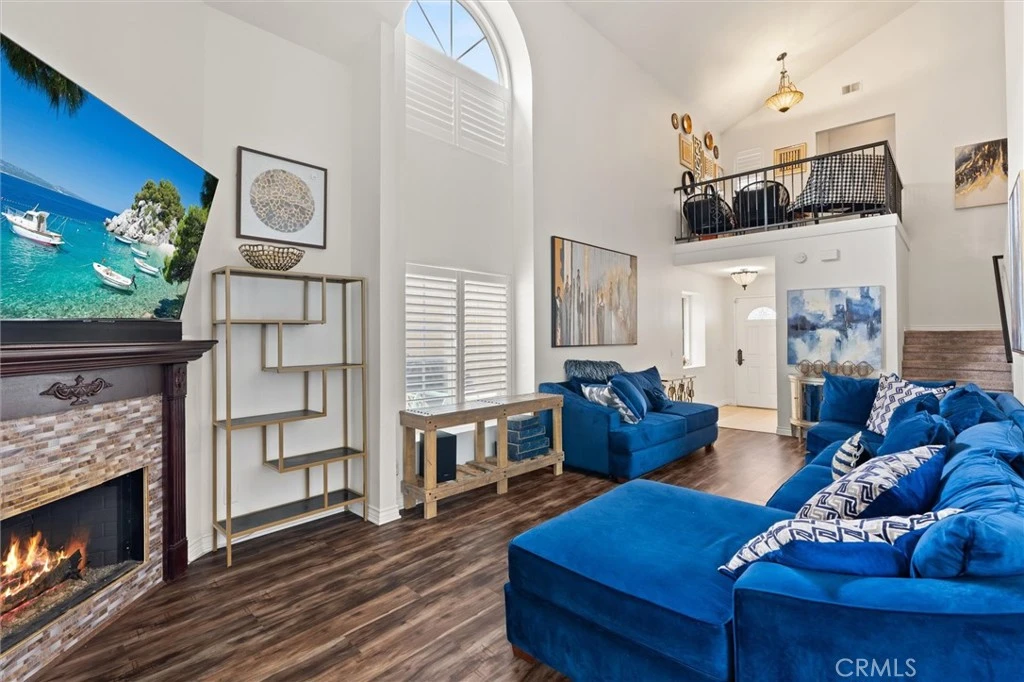 Presenting an outstanding central location in Bellflower, this turnkey home offers style, custom upgrades and generous room to grow. Nearly 1,728 square feet, the open-concept design features three bedrooms, two- and one-half baths, and a versatile loft. An entry with custom stained-glass window leads to an impressive living room with dramatic double-height ceiling, French doors opening to the backyard, and a custom corner fireplace, making the area perfect for relaxing, entertaining, or kicking back with friends on movie night. The kitchen is equally impressive and shines with solid-surface countertops, a large peninsula that is great for serving and food prep, a custom sink, dining area, white cabinetry with crown molding, a full tile backsplash, spacious pantry, recessed lighting, adjacent interior laundry room, and upgraded stainless steel appliances including a Samsung French door refrigerator with LCD display. An attached two-car garage with direct access is featured on this level, and the driveway accommodates off-street parking for two more. The powder room showcases an elegant custom vanity, and second-floor baths are appointed with custom sinks. Enjoy a private ensuite bath and two closets in the primary suite. Additional upgrades are led by plantation shutters, tile and vinyl-plank flooring, and elegant lighting fixtures. Summertime barbecues and evening cocktail parties will be a delight in the backyard, where a brick patio, retractable awning and lifelike turf are on display. Convenient to major freeways, downtown Los Angeles and beach cities, the home is just moments from schools, parks and shopping center