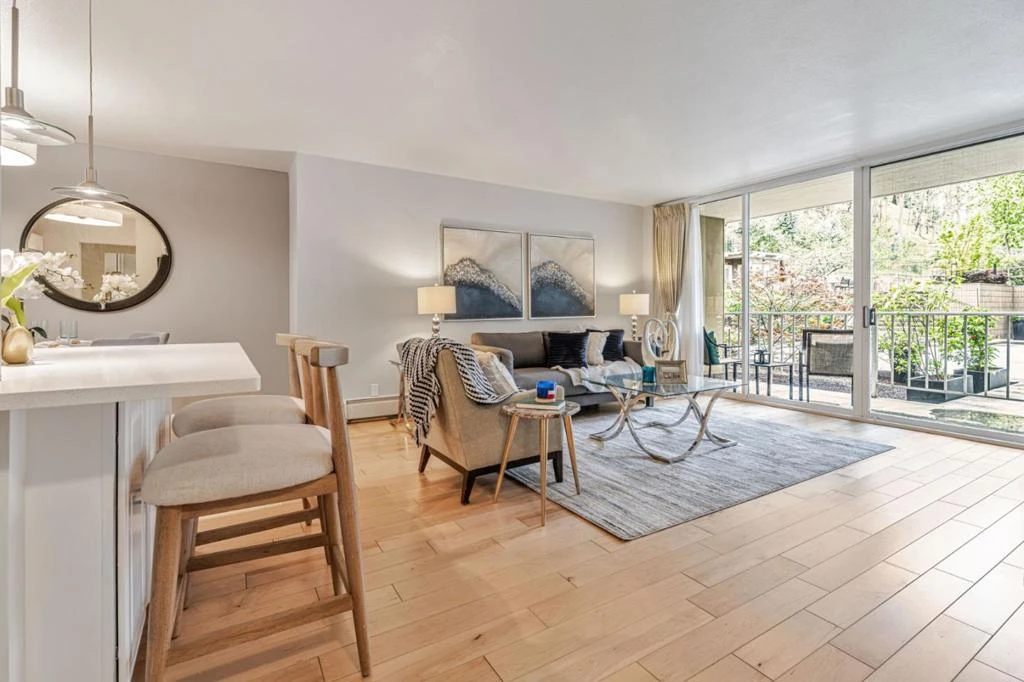 This updated end unit 1-bedroom condo offers modern upgrades, a true open-concept layout, and impressive storage - all in a peaceful garden setting. Located on the ground floor with zero steps from the deeded parking space to the front door, the home opens to a private patio with serene courtyard views - ideal for morning coffee or evening relaxation. Inside, the open layout connects the living, dining, and kitchen areas into one bright, versatile space. The kitchen features quartz countertops, porcelain tile flooring, stainless appliances, custom maple cabinetry, and a breakfast bar with built-in shelving. A mirrored wall reflects light throughout the space and discreetly conceals a spacious pantry closet. Designed with modern comfort in mind, this home is bright, inviting, and move-in ready. It includes one deeded parking space and storage unit. The HOA covers heat, water, garbage, common insurance, and access to premium amenities, including two pools, two spas, a fitness center, a billiards room, and a stunning sky room with panoramic city views and a deck. Just steps from Davey Glen Park and minutes to Caltrain, shopping, dining, and major commuter routes!