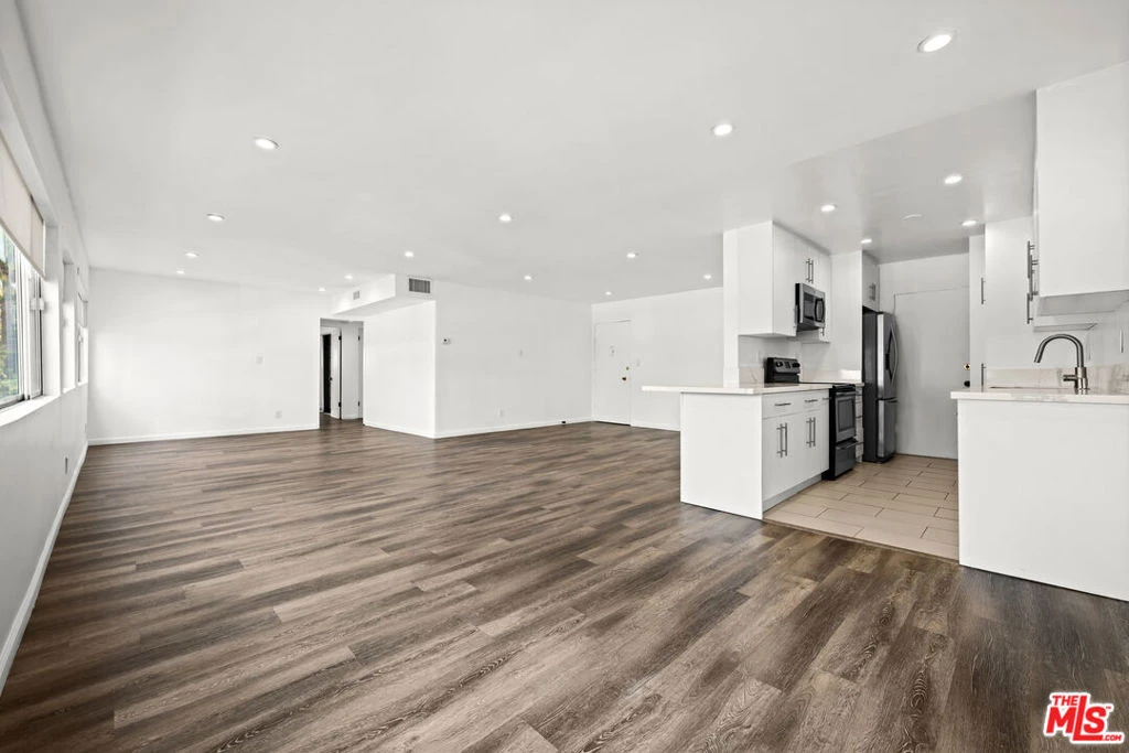 Perched on the 3rd floor in the heart of Beverly Hills, this fully remodeled 2-bedroom, 2-bath residence is bright, airy, and move-in ready. The expansive living and dining area is flooded with natural light from a wall of oversized windows, creating an ideal space for both relaxing and entertaining. The updated kitchen features sleek modern cabinetry, quartz-style countertops, and stainless steel appliances, with a clean, contemporary finish throughout. Both bathrooms have been thoughtfully renovated with designer-style fixtures, modern vanities, and crisp tilework for a spa-like feel. The spacious primary suite offers great scale and comfort, plus direct access to a private balcony perfect for morning coffee or evening downtime. Additional highlights include recessed lighting, wide-plank flooring, and a fresh, modern palette that complements the home's abundant light.