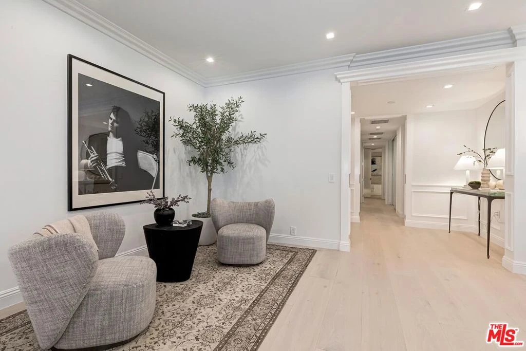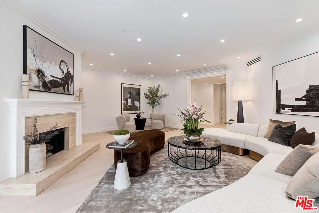 Best quiet location in building, with southern exposure. An elegant sanctuary in the heart of Beverly Hills, this sleek, modern, and timeless residence designed and completely renovated new by a notable European design team offers the rare feeling of living within your own secure, private enclave just moments from the city's most celebrated destinations. Thoughtfully curated and impeccably executed, every detail reflects refined elegance, from wide-plank white oak flooring throughout to custom built-ins, streamlined new appliances, and bespoke walk-in closets with tailored cabinetry. Stunning and private, this sun-drenched, south-facing two-bedroom residence with a flexible den ideal as a home office, media or viewing room, or convertible third guest space is located in one of Beverly Hills' most coveted full-service buildings. Set on a serene, tree-lined street just steps from Cedars-Sinai, the Beverly Hills, and the boutiques and restaurants on Robertson Blvd, the home enjoys a highly desirable south-facing floor plan, generous street setback, and exceptional natural light throughout. The beautifully designed interiors are defined by floor-to-ceiling windows, modern energy-efficient recessed lighting, elegant crown moldings, and custom wainscoting, creating a refined yet welcoming ambiance. Designed for effortless entertaining, the residence features a gracious living room with fireplace opening to a private terrace, a formal dining room, and a spacious den with wet bar suited for entertaining, relaxing, or working from home. The bright, elegant gourmet kitchen is both functional and visually striking, appointed with porcelain countertops, top-of-the-line appliances, custom cabinetry accented by dramatic under-counter lighting, and a sunlit breakfast area overlooking lush greenery. The expansive primary suite is a true retreat, offering custom walk-in closets and a luxurious spa-inspired bath with dual vanities, separate water closets, a soaking tub, and an oversized walk-in shower delivering a five-star hotel experience in the comfort of home. The second bedroom features a custom closet and a beautifully finished en-suite bath, while a dedicated laundry room with built-in cabinetry completes the residence. The IV Seasons North complex has recently undergone thoughtful updates to its lobby, corridors & elevators and is renowned for its exceptional full-service lifestyle. Amenities include 24-hour doormen, valet and concierge services for residents and guests, a heated pool and spa, a fully equipped fitness center, secured parking, and additional storage. Moments from Rodeo Drive, the Beverly Hills Hotel, world-class dining, shopping, and cultural landmarks and with easy access to West Hollywood and the Farmers Market this exceptional residence presents a rare opportunity to enjoy an elevated, turnkey in-town pied-a-terre defined by timeless design, premier services, and the unmistakable sophistication of Beverly Hills.