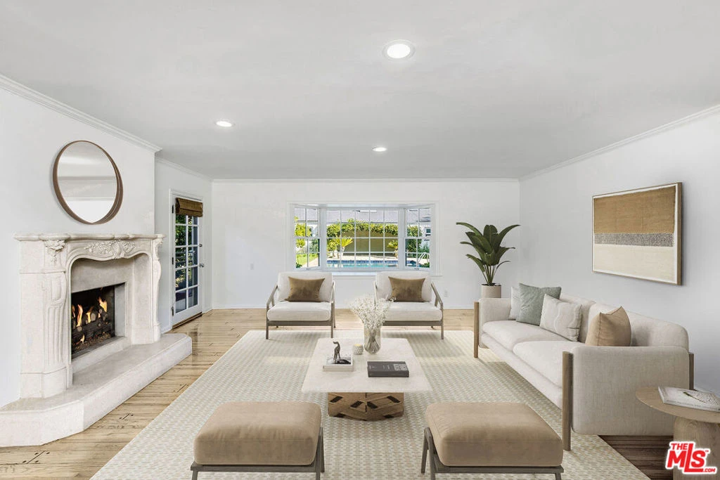 This stunning Traditional gated estate is nestled in the heart of Beverly Hills, offering a seamless blend of timeless elegance and amenities. Set behind gates with a grand circular driveway and a lush front yard, this two-story residence features 5 bedrooms, 6 bathrooms, and newly installed natural light wood floors throughout.Upstairs, the residence showcases four spacious bedrooms, each ensuite with soaring ceilings and oversized bay windows that frame beautiful views of the sparkling pool and meticulously landscaped gardens. The fifth bedroom is downstairs and ideal as a maid's room, nanny's room, or in-law suite, offering privacy and convenience with a separate entrance/exit and dedicated quarters just off the kitchen.An inviting formal living room, anchored by a cozy fireplace, flows seamlessly into an expansive family room, also featuring a fireplace, enhanced by large bay windows overlooking the pool and vibrant flower gardens, creating a serene and picturesque atmosphere. A versatile room off the kitchen with large windows offers an ideal space for a home office or playroom, adding flexibility to the residence's thoughtful layout. Additionally, a spacious dining room offers generous space for both entertaining and everyday living.The kitchen is a true chef's dream, complete with new white marble countertops, a butler's pantry, and a charming breakfast room. Sliding doors open directly to the BBQ patio area and pool deck, creating effortless indoor-outdoor flow and perfect conditions for al fresco dining and entertaining.The front yard is framed by manicured grass and mature landscaping, enhancing the home's sense of privacy and curb appeal, while the backyard unfolds as a true oasis with a lush grassy lawn, pomegranate and lemon trees, and a sparkling pool. For added luxury, two fully remodeled cabana rooms, each with full bathrooms and showers, provide exceptional, separate accommodations for family or guests.This exquisite Beverly Hills estate is a rare offering, blending classic architectural charm with thoughtful modern updates, and is perfectly suited for those seeking comfort, privacy, and elevated California living.