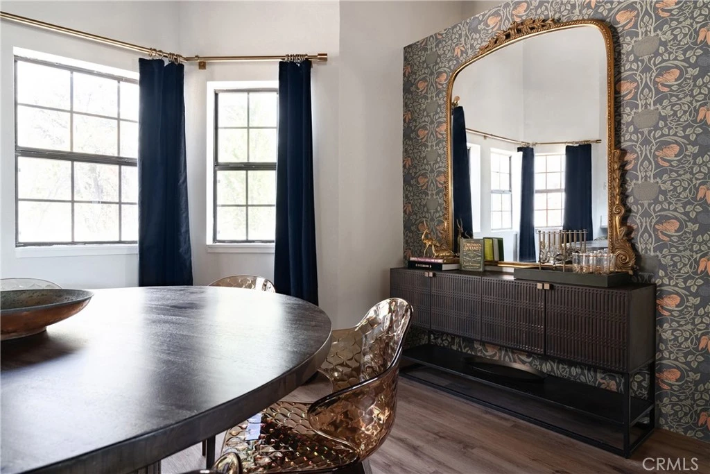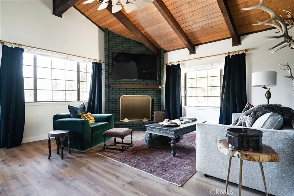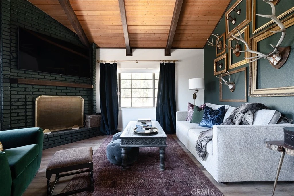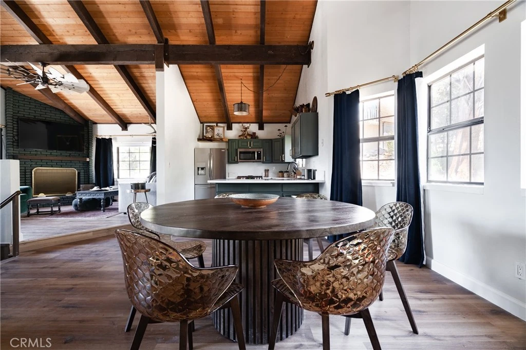 On a quiet Big Bear City street, this thoughtfully remodeled and professionally designed mountain home blends architectural character with modern comfort in a way that feels elevated and inviting. Vaulted, wood-beamed ceilings, rich textures, and curated design moments create a space that feels warm, expressive, and welcoming, ideal for those who value creativity, connection, and a slower mountain rhythm. The main level is designed for gathering and everyday living, anchored by a striking stone fireplace and filled with natural light. An open kitchen with generous prep space, breakfast bar seating, and modern appliances flows easily into a spacious dining area, perfect for long dinners, creative work sessions, or hosting friends and family. Multiple living areas offer flexibility for conversation, quiet moments, or settling in after a day outdoors. With four bedrooms and two bathrooms, the layout comfortably accommodates families and guests while still allowing separation between living and sleeping spaces. The lower level offers additional living space and a large recreation area, creating room for games, hobbies, or a flexible studio-style setup depending on your needs. Throughout the home, finishes and details strike a balance between warmth and refinement, with a palette that feels grounded, calm, and timeless. Outdoor spaces include a dedicated fire pit area and a spa tucked into a private setting, ideal for evenings under the stars or slow mornings surrounded by trees. Practical upgrades include air conditioning, an EV charger, and a two-car attached garage that has functioned as a versatile game and recreation space, supporting both full-time living and extended mountain stays. Conveniently located near trails, the lake, ski resorts, and local amenities, this home offers a rare combination of privacy, proximity, and personality. A place to create, recharge, and make memories without sacrificing comfort or style.