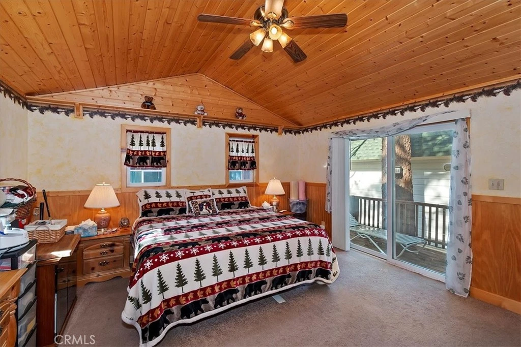 ESCAPE TO THIS CHARMING MOUNTAIN RETREAT IN THE HEART OF BIG BEAR LAKE! Ideally located just minutes from the lake, marinas, the Village, ski resorts, snow play, and all the best Big Bear amenities. Step inside and immediately feel the warmth of the knotty pine tongue-and-groove walls and ceilings, giving the home its timeless rustic charm. This inviting single-story layout offers an open living area anchored by a classic brick fireplace, along with a fully equipped kitchen featuring abundant cabinetry, butcher-block counters, and slate flooring. Two spacious bedrooms and updated slate-floored bathrooms provide comfort and convenience, along with washer/dryer hookups. A two-car detached garage offers even more versatility with its freestanding wood-burning stove and convenient half bath. Enjoy the low-maintenance front yard with white vinyl fencing, synthetic turf, and Trex-style decking—perfect for year-round enjoyment. Southern exposure ensures quick snow melt, and the large driveway provides plenty of off-street parking. A sizable storage shed in the backyard adds even more functionality. Whether you're seeking a full-time home, a weekend escape, or an income-producing investment, this mountain gem is ready to welcome you.