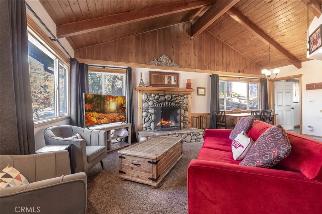 Priced Aggressively! Charming Big Bear Lake cabin just steps from The Village! This updated 2-bedroom, 1-bath retreat offers vaulted wood-beam ceilings, a cozy river-rock fireplace, and tasteful upgrades throughout. Enjoy pine cabinetry, granite-tile counters, tile flooring, dual-pane windows, and a beautifully tiled bath. Both bedrooms feature sliding glass doors and elevated ceilings, creating a bright, airy feel. A spacious laundry/mud room adds convenience. Outside, relax on the stamped-concrete patio with peek-a-boo lake views or entertain on the back deck surrounded by mature pines. Large front and rear parking areas provide plenty of space for guests. Located less than 1/3 mile to The Village, the marina, and minutes to ski resorts, this cabin is ideal as a personal getaway or proven vacation rental. This home embodies the best of Big Bear living — whether you’re seeking personal escape or rental return.