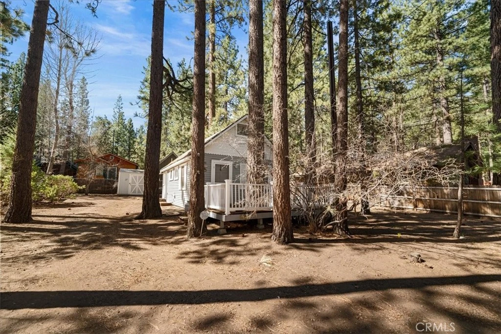 LOWER MOONRIDGE! One-bedroom, one-bath mountain cabin nestled in desirable lower Moonridge, just minutes from Bear Mountain slopes and Moonridge Village. Situated on a spacious 7,500 sq. ft. fully fenced lot with beautiful trees, a shed, and a wood shed—perfect for mountain living. Inside, enjoy warm wood-paneled walls, beamed ceilings, and a cozy wood stove that enhances the classic cabin feel. A bonus loft adds extra space for guests or storage (not included in square footage). With durable vinyl siding on the exterior, this home is a perfect year-round retreat or rental opportunity in a prime Big Bear location.