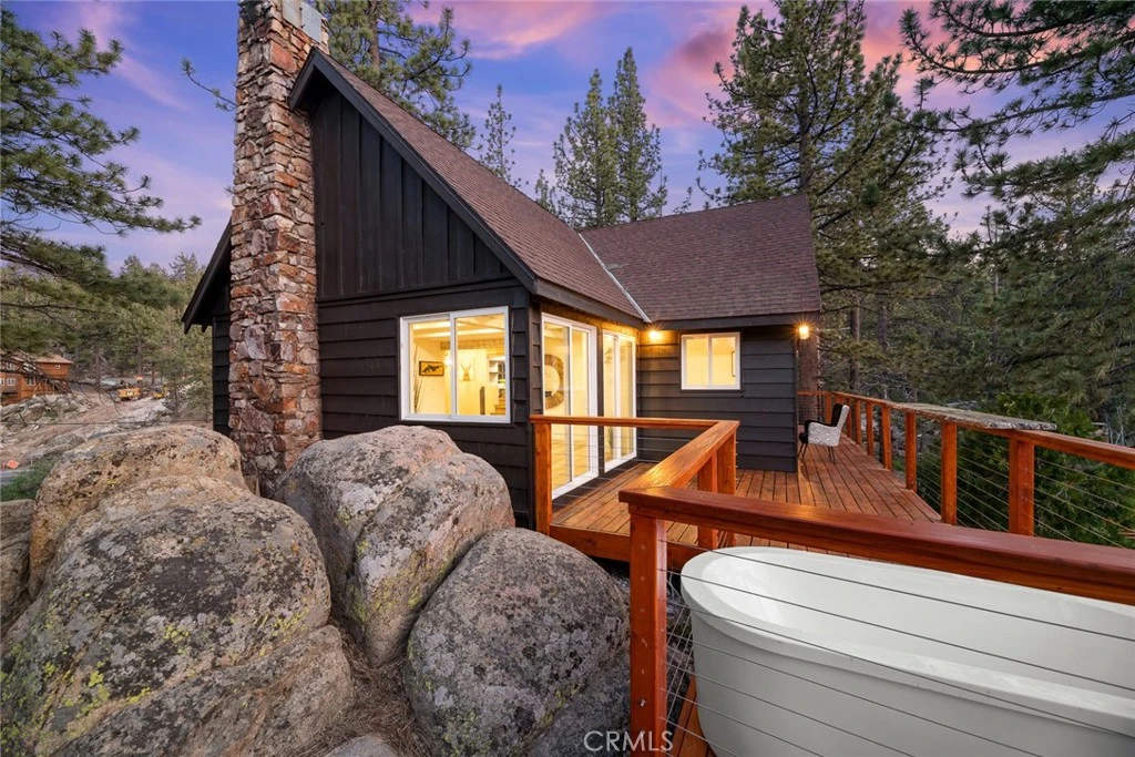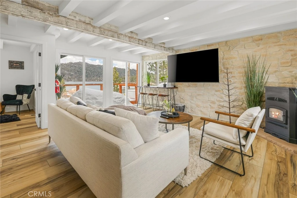A BOULDER BAY LAKEFRONT BEAUTY! Permanently unobstructed lake views from every window of the house. Fully renovated 3 bedroom/2 bath with bonus room that could be a 4th bedroom or game room that sits at the entrance to Big Bear Lake. Walk to Boulder Bay Park, kayak rentals, a mini mart, and a restaurant that is a local favorite. Home has state of the art kitchen with gourmet Bosch appliances, gorgeous granite, deep farmhouse sink, hidden washer and dryer, breakfast bar, and open space kitchen and dining area to living room. Light and bright living room has brand relatively new pellet stove and opens up to decking with breathtaking views of the lake, outdoor granite bar top, and soaking tub in the boulders. 2 bedrooms and full bathroom on this level ~ Top level of house is a loft style bedroom with separate sitting area and another beautiful bathroom. Bonus room has a bar area on one side and wine cellar area behind the huge boulder on the other, spiral staircase to connect to the upper floors. 80 feet of lakefront with dock privileges up to a 3-slip dock. Relatively new forced air heating, tankless water heater and insulation. House is ready to go with no upgrades needed! Perfect getaway retreat and/or investment property as this is a very successful Airbnb short term rental. Make this your own with a little bit of love and enjoy all that Big Bear has to offer. This one you don't want to miss!