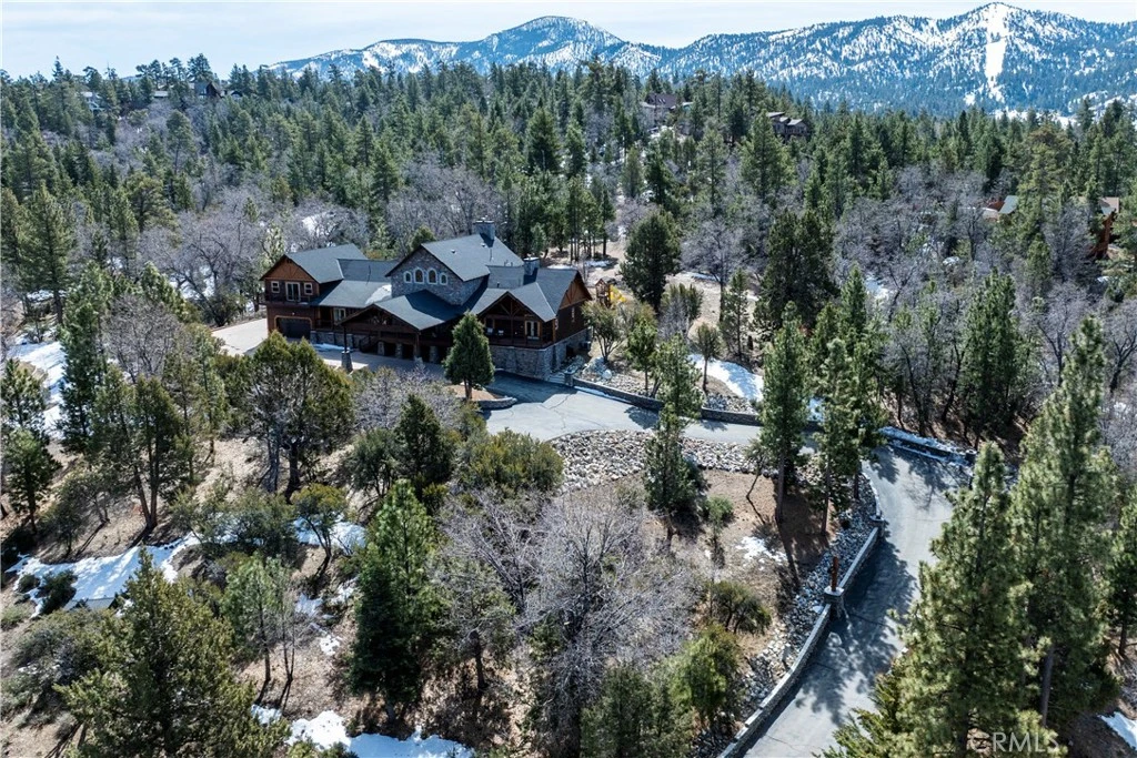 A luxurious 5-bedroom, 6-bath custom mountain estate located in the gated Fox Farm area. Built in 2007, the home spans nearly 5,000 sq ft on a private 1.87-acre lot. Grand entry with soaring wood-beamed cathedral ceilings and slate floor. Open floorplan with multiple living areas, including a family room, formal living, loft/game room with wet bar. Gourmet kitchen: warm wood cabinetry, stainless appliances, granite countertops, breakfast bar, and walk-in pantry. Wine room: temperature-controlled, adjacent to kitchen. Fireplaces (3 total): located in living room, family room, and the master suite, all adorned with stacked-stone finishes. Composite decks at both front and back, accessible from all bedrooms, offering serene forest and mountain views. Large covered front porch and a matching rear deck for entertaining. Four-car attached garage + porte cochère & driveway with gated private drive. Bonus office/nursery off the primary suite, complete with custom dog-run. Temperature-controlled wine room & walk-in pantry for storage convenience. HVAC with central air, whole house humidifier, forced-air heating. Luxury finishes: beamed ceilings, slate/tile/wood flooring, double-pane windows, wet bar. Security system owned. Captivating views of surrounding mountains and forest from multiple vantage points Located in Big Bear’s central Fox Farm area, just minutes from ski slopes, the lake, hiking, and local amenities. Gated entry with private road leading up to property. Offered fully furnished. ZONED SAN BERNARDINO COUNTY - ALMOST 2 ACRES - CAN BUILD ADU - CONTACT COUNTY FOR DETAILS.